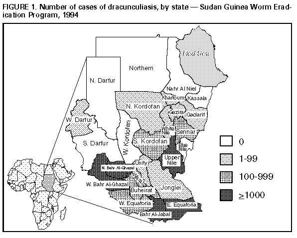 Persons using assistive technology might not be able to fully access information in this file. For assistance, please send e-mail to: mmwrq@cdc.gov. Type 508 Accommodation and the title of the report in the subject line of e-mail. Implementation of Health Initiatives During a Cease-Fire -- Sudan, 1995In 1994, Sudan (1994 population: 27 million) reported to the World Health Organization (WHO) one third of the global total of cases of dracunculiasis (i.e., Guinea worm disease), which is targeted for eradication by the end of 1995 (1,2). On March 27, 1995, the government of Sudan announced a cease-fire of 2 months' duration in the 12-year-old civil war in the southern part of the country--both sides agreed to the cease-fire primarily to permit acceleration of efforts to eradicate dracunculiasis and to promote treatment of other health problems including onchocerciasis (i.e., river blindness), administration of childhood vaccines, and distribution of vitamin A. This report summarizes the status of dracunculiasis and onchocerciasis in Sudan and provisional information on activities undertaken by the government of Sudan and other organizations during the cease-fire. In 1994, the national Guinea Worm Eradication Program in Sudan reported to WHO a total of 780 villages with endemic drancunculiasis and 53,271 cases. The states with the highest prevalence of disease were Upper Nile, Bahr Al-Jabal, Eastern Equatoria, Western Bahr Al-Ghazal, and Northern Bahr Al-Gazal states Figure_1. As of 1995, the prevalence of onchocerciasis in Sudan was estimated to be 620,000. Southern Sudan also includes the most highly endemic foci for blinding onchocerciasis; the main endemic foci are located in Western Equatoria, Northern Bahr Al-Ghazal, and Western Bahr Al-Ghazal States Figure_2. Immediately after the cease-fire was announced, the Carter Center and CDC began providing technical assistance to complement preexisting activities conducted by the United Nations Children's Fund (UNICEF), bilateral donors, and nongovernmental organizations. During the cease-fire, health workers from several organizations (including the Sudan Guinea Worm Eradication Program, the onchocerciasis and vaccination programs, and nongovernmental organizations), in collaboration with UNICEF's Operation Lifeline Sudan, trained approximately 1265 additional community health volunteers and deployed about 30 mobile teams of health workers. On April 27, health leaders from both sides met in Juba, Sudan, to exchange information, including maps showing the location of villages with endemic drancunculiasis to help ensure maximum coverage for investigation and interventions. Accelerated interventions began in late April. From late April through June 13, a total of 2028 villages were visited, including at least 651 villages in which dracunculiasis was first documented during the visit. Health workers identified 8922 new cases of dracunculiasis and distributed 87,703 cloth filters to households in villages with endemic disease. Through June 13, a provisional total of 9454 cases of dracunculiasis had been reported during 1995, including the cases newly identified during the cease-fire. In comparison, during January-May 1994, 15,798 cases were reported. During the same period, mass oral treatment for onchocerciasis with ivermectin was initiated for the first time in many of the areas in the country with the highest prevalence of disease. Treatment was administered to a total of 25,499 persons from 84 villages in parts of Bahr Al-Ghazal and Equatoria zones, in which prevalences in 28 villages exceeded 40%, and to most eligible persons in the area around Raga, Western Bahr Al-Ghazal state. Assessments are continuing in other areas of the two zones with suspected endemic disease. As of June 13, at least 30,865 children had received oral poliovirus vaccine, 35,996 were vaccinated against measles, and 19,204 had received bacille Calmette-Guerin (BCG) vaccination. In addition, 29,349 children had received vitamin A, and oral rehydration treatment had been administered to at least 5475 children with diarrhea. Health workers also had conducted health-education sessions to promote prevention of dracunculiasis, onchocerciasis, and diarrhea and to promote vaccination of children. Reported by: Federal Ministry of Health, Khartoum, Sudan. Global 2000, Inc, The Carter Center; Task Force for Child Survival and Development; Mectizan Donation Program, Atlanta. World Health Organization Collaborating Center for Research, Training, and Eradication of Dracunculiasis, Div of Parasitic Diseases, National Center for Infectious Diseases; International Health Program Office; National Immunization Program, CDC. Editorial NoteEditorial Note: The cease-fire in Sudan permitted rapid development and implementation of activities to address dracunculiasis and other priority health problems. Interventions against dracunculiasis and onchocerciasis were expanded substantially from earlier levels and should accelerate the control of these diseases in Sudan and aid the global eradication effort. In 1994, control measures for dracunculiasis had been provided to approximately 50% of the villages with known endemic disease, and distribution of ivermectin to treat onchocerciasis in the southern part of the country had been restricted to only a limited number of clinics. Because of this "Guinea worm cease-fire" in Sudan, the global campaign to eradicate dracunculiasis now encompasses all countries with endemic disease. In addition, this cease-fire is an unprecedented opportunity for Sudan to intensify efforts to eradicate poliomyelitis and to control onchocerciasis, measles, and vitamin A deficiency. Efforts to address health problems during negotiated periods of tranquility in civil and military strife have been conducted previously in Lebanon, El Salvador, Sudan, and other countries; however, the duration of these efforts has been substantially shorter than the current program in Sudan. On