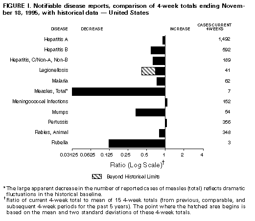 Persons using assistive technology might not be able to fully access information in this file. For assistance, please send e-mail to: mmwrq@cdc.gov. Type 508 Accommodation and the title of the report in the subject line of e-mail. Notifiable Diseases/Deaths in Selected Cities Weekly InformationFigure_I Notifiable disease reports, comparison of 4-week totals ending November 18, 1995, with historical data -- United States Table_I Summary -- cases of specified notifiable diseases, United States, cumulative, week ending November 18, 1995 (46th Week) Table_II Cases of selected notifiable diseases, United States, weeks ending November 18, 1995 and November 19, 1994 (46th Week) Table_III Deaths in 121 U.S. cities, week ending