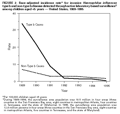Persons using assistive technology might not be able to fully access information in this file. For assistance, please send e-mail to: mmwrq@cdc.gov. Type 508 Accommodation and the title of the report in the subject line of e-mail. Progress Toward Elimination of Haemophilus influenzae Type b Disease Among Infants and Children -- United States, 1987-1995Before effective vaccines were available, Haemophilus influenzae type b (Hib) was the most common cause of bacterial meningitis among children in the United States, and an estimated one of 200 children aged less than 5 years developed invasive Hib disease (1-4). From December 1987 -- when Hib conjugate vaccines were introduced -- through 1994, the incidence of invasive Hib disease declined 95% among children aged less than 5 years (4,5). Eliminating invasive Hib disease among children aged less than 5 years by 1996 is a goal of the Childhood Immunization Initiative (CII) (6). This report summarizes data about trends in invasive H. influenzae (Hi) disease during 1987-1995 from three separate surveillance systems (CDC's National Notifiable Diseases Surveillance System [NNDSS]; the National Bacterial Meningitis and Bacteremia Reporting System [NBMBRS]; and an active, multistate, laboratory-based surveillance system). The findings underscore the need for age-appropriate vaccination of infants and for complete investigation and reporting of cases of invasive Hi disease (2). National Surveillance State health agencies report weekly provisional notifiable diseases data to NNDSS through the National Electronic Telecommunications System for Surveillance (NETSS) (7,8). Because the primary purpose of NNDSS is timely national surveillance, the information transmitted includes only basic demographic data about persons with invasive Hi disease. NETSS permits electronic transmission of critical supplemental information (e.g., the type of clinical illness, serotype causing disease, Hib vaccination status, and clinical outcome) for cases of Hi disease; these data were reported consistently by approximately 25 states. NBMBRS collects information about invasive bacterial diseases in the United States and includes detailed information about each case identical to the supplemental information transmitted through NETSS. Approximately 11 states participated consistently in reporting through NBMBRS. During June-July 1996, all states were contacted to obtain additional supplemental information about Hi disease among children aged less than 5 years who had onset of disease in 1995. Three states confirmed that no Hi cases had been reported in children aged less than 5 years while the remaining 47 states, the District of Columbia, and New York City submitted additional supplemental data. During 1987-1995, the incidence of invasive Hi disease among children aged less than 5 years declined 96% (from 41 cases per 100,000 children to 1.6) (Figure_1) (5). However, the incidence of Hi disease among persons aged greater than or equal to 5 years remained stable during this period. Of the 317 cases of invasive Hi disease among children aged less than 5 years reported in 1995, serotype data were available for 201 (63%) cases. In 1995, Hib accounted for 86 (43%) isolates for which serotype was known; of these, 47 (55%) cases occurred among non-Hispanic whites, 13 (15%) among non-Hispanic blacks, five (6%) among American Indians/Alaskan Natives, two (2%) among Asians/Pacific Islanders, and 12 (14%) among Hispanics; race/ethnicity data were missing for seven (8%). Of the 74 (86%) Hib case-patients identified in 1995 for whom information about age and vaccination status were available, 33 (45%) were unvaccinated and 41 (55%) had received at least one Hib-containing vaccine; all but three children had their first vaccination at age less than 7 months (Table_1). Twenty-two children were age-appropriately vaccinated before disease onset, including three children who began the series late. Among 18 children who had completed a primary series before onset of Hib disease, each had completed the two- or three-dose series with one of the three licensed vaccines (i.e., vaccines had not been used interchangeably). Vaccine manufacturer lot numbers were available for 12 of the 18 children; among these children, no single lot was used to complete the series. Laboratory-Based Surveillance The active laboratory-based system coordinated by CDC includes surveillance projects which, during 1989-1994, maintained continuous surveillance of 10.5 million persons in four areas (three counties in the San Francisco Bay area, eight counties in metropolitan Atlanta, four counties in Tennessee, and the state of Oklahoma) (5). During 1995, the population under surveillance was 12.8 million persons in four areas (three counties in the San Francisco Bay area, eight counties in metropolitan Atlanta, five counties in Tennessee, and the state of Maryland). Information routinely obtained about all cases of invasive Hi disease included serotype, clinical syndrome and outcome, vaccination status, and demographic information. Because blacks were overrepresented in the surveillance population, rates were race-adjusted to the 1990 U.S. population. During 1989-1995, the race-adjusted incidence of invasive Hib disease among children aged less than 5 years decreased substantially compared with the decrease in incidence of non-type b Hi disease among children (Figure_2). Among children aged less than 5 years, during 1989-1995 the incidence of invasive Hib cases declined 99% (from 34 cases per 100,000 in 1989 to 0.4 cases in 1995). During 1995, Hib accounted for 18% of all the Hi isolates serotyped from children aged less than 5 years. Information about vaccination status was available for one of the four children aged less than 5 years with invasive Hib disease. This infant had received one dose of vaccine, although he was aged 4.5 months at disease onset and was eligible to have received two doses. One child was too young t