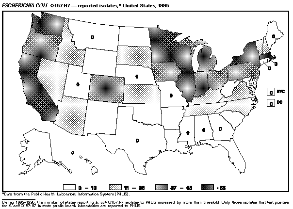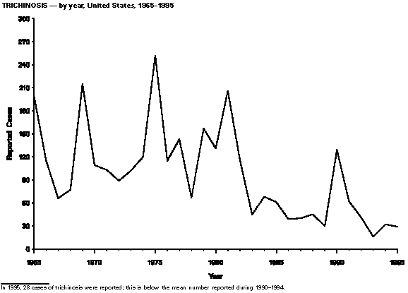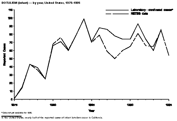 Persons using assistive technology might not be able to fully access information in this file. For assistance, please send e-mail to: mmwrq@cdc.gov. Type 508 Accommodation and the title of the report in the subject line of e-mail. Summary of Notifiable Diseases, United States, 1995Foreword This publication contains summary tables of the official statistics for the reported occurrence of nationally notifiable diseases in the United States for 1995. These statistics are collected and compiled from reports to the National Notifiable Diseases Surveillance System (NNDSS), which is operated by CDC in collaboration with the Council of State and Territorial Epidemiologists (CSTE). Because the dates of onset and dates of diagnosis for notifiable diseases may not always be reported, these surveillance data are presented by the week that they were reported to CDC by public health officials in state and territorial health departments. These data are finalized and published in the MMWR Summary of Notifiable Diseases, United States for use by state and local health departments; schools of medicine and public health; communications media; local, state, and federal agencies; and other agencies or persons interested in following the trends of reportable diseases in the United States. The annual publication of the Summary also documents which diseases are considered national priorities for notification and the annual number of cases of such diseases. Part 1 contains information regarding morbidity for each of the diseases considered nationally notifiable during 1995. The tables provide the number of cases of notifiable diseases reported to CDC for 1995, as well as the distribution of cases by month and geographic location and by patient's age, sex, race, and Hispanic ethnicity. The data are final totals as of July 26, 1996, unless otherwise noted. There were no reported cases of anthrax, diphtheria, and yellow fever in the United States during 1995; thus, these three nationally notifiable diseases do not appear in the tables in Part 1. In all tables, leprosy is listed as Hansen disease and tickborne typhus fever is listed as Rocky Mountain spotted fever (RMSF). Part 2 contains graphs and maps. These graphs and maps depict summary data for many of the notifiable diseases that are described in tabular form in Part 1. Part 3 includes tables that list the number of cases of notifiable diseases reported to CDC since 1966. It also includes a table enumerating deaths associated with specified notifiable diseases that were reported to the National Center for Health Statistics, CDC, during 1984-1993. Background As of January 1, 1995, 49 infectious diseases were designated as notifiable at the national level. A notifiable disease is one for which regular, frequent, and timely information regarding individual cases is considered necessary for the prevention and control of the disease. This section briefly summarizes the history of the reporting of nationally notifiable diseases in the United States. In 1878, Congress authorized the U.S. Marine Hospital Service (i.e., the forerunner of the Public Health Service {PHS}) to collect morbidity reports regarding cholera, smallpox, plague, and yellow fever from U.S. consuls overseas; this information was to be used for instituting quarantine measures to prevent the introduction and spread of these diseases into the United States. In 1879, a specific Congressional appropriation was made for the collection and publication of reports of these notifiable diseases. The authority for weekly reporting and publication of these reports was expanded by Congress in 1893 to include data from states and municipal authorities. To increase the uniformity of the data, Congress enacted a law in 1902 directing the Surgeon General to provide forms for the collection and compilation of data and for the publication of reports at the national level. In 1912, state and territorial health authorities -- in conjunction with PHS -- recommended immediate telegraphic reporting of five infectious diseases and the monthly reporting, by letter, of 10 additional diseases. The first annual summary of The Notifiable Diseases in 1912 included reports of 10 diseases from 19 states, the District of Columbia, and Hawaii. By 1928, all states, the District of Columbia, Hawaii, and Puerto Rico were participating in national reporting of 29 specified diseases. At their annual meeting in 1950, the State and Territorial Health Officers authorized a conference of state and territorial epidemiologists whose purpose was to determine which diseases should be reported to PHS. In 1961, CDC assumed responsibility for the collection and publication of data concerning nationally notifiable diseases. The list of nationally notifiable diseases is revised periodically. For example, a disease may be added to the list as a new pathogen emerges, or a disease may be deleted as its incidence declines. Public health officials at state health departments and CDC continue to collaborate in determining which diseases should be nationally notifiable; CSTE, with input from CDC, makes recommendations annually for additions and deletions to the list of nationally notifiable diseases. However, reporting of nationally notifiable diseases to CDC by the states is voluntary. Reporting is currently mandated (i.e., by state legislation or regulation) only at the state level. The list of diseases that are considered notifiable, therefore, varies slightly by state. All states generally report the internationally quarantinable diseases (i.e., cholera, plague, and yellow fever) in compliance with the World Health Organization's International Health Regulations. CSTE and CDC held a national surveillance conference November 30- December 2, 1994, to review the state of national surveillance for infectious diseases. Conditions that were approved for addition to national surveillance during 1995 are genital infections caused by Chlamydia trachomatis, coccid