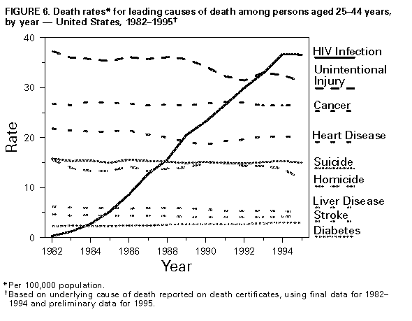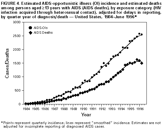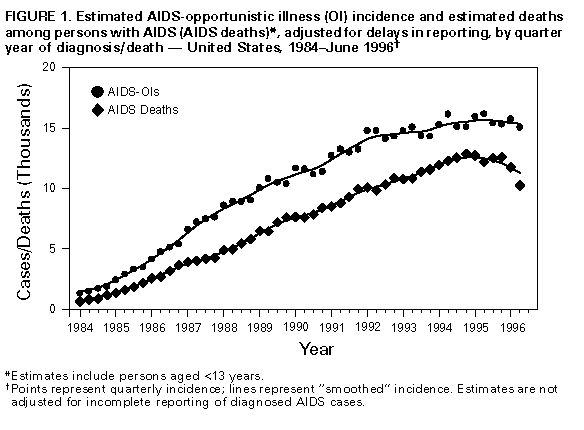 Persons using assistive technology might not be able to fully access information in this file. For assistance, please send e-mail to: mmwrq@cdc.gov. Type 508 Accommodation and the title of the report in the subject line of e-mail. Update: Trends in AIDS Incidence, Deaths, and Prevalence -- United States, 1996bloodborne pathogens (MMWR 1988;37:377-82, 387-8 and MMWR 1987;36{no. S2}). The national acquired immunodeficiency syndrome (AIDS) surveillance system is used to describe the impact of HIV-related morbidity and death in the United States. This report presents trends in AIDS incidence during 1996 and describes recent declines in deaths among persons reported with AIDS (AIDS deaths) and increases in AIDS prevalence. * Cumulative AIDS cases among persons aged greater than or equal to 13 years reported to CDC based on the 1993 expanded surveillance case definition from the 50 states, the District of Columbia, Puerto Rico, and the U.S. territories were analyzed by year of report, race/ethnicity, and mode of risk/exposure (1). Estimates of AIDS incidence and deaths were adjusted for the effects of delays in reporting. For analyses by mode of risk/exposure, estimates were adjusted for the anticipated reclassification of cases initially reported without an HIV risk/exposure (1). To adjust for the expansion of the reporting criteria in 1993, estimates of the incidence of AIDS-opportunistic illnesses (OIs) were calculated from the sum of cases diagnosed with an AIDS-OI and the estimated dates of an AIDS-OI diagnosis for cases reported based on immunologic criteria ** (1). AIDS-OI incidence was estimated quarterly through June 1996, the most recent period for which reliable estimates were available. Estimates of AIDS-OI incidence rates per 100,000 population were based on 1995 population estimates from the Bureau of the Census. Deaths among persons with AIDS were identified by review of medical records and death certificates and include both deaths from AIDS and from other causes. AIDS prevalence was estimated from cumulative AIDS incidence minus cumulative deaths. Reported AIDS Cases From 1981 through 1996, a total of 573,800 persons aged greater than or equal to 13 years with AIDS were reported to CDC by state and local health departments (Table_1). The expansion of the AIDS surveillance case definition in 1993 resulted in a large increase in reported cases during 1993 followed by declines in numbers of AIDS cases reported each year from 1994 through 1996. The 68,473 AIDS cases reported during 1996 was substantially higher (47%) than the number reported during 1992. From 1992 through 1996, non-Hispanic blacks, Hispanics, and women accounted for increasing proportions of persons reported with AIDS. In 1996, non-Hispanic blacks accounted for 41% of adults reported with AIDS, exceeding for the first time the proportion who were non-Hispanic white, and women accounted for an all-time high of 20% of adults reported with AIDS. AIDS-OI Incidence In 1995, AIDS-OIs were diagnosed in an estimated 62,200 persons, an increase of 2% over the estimate for 1994 (61,200) (Figure_1). From January 1994 through June 1996, the quarterly incidence of AIDS-OIs was stable (mean: 15,200 cases per quarter). During 1995, estimated AIDS-OI incidence rates per 100,000 population were approximately sevenfold higher among non-Hispanic blacks (99) and threefold higher among Hispanics (50) than among non-Hispanic whites (15). Estimated rates were lowest among American Indians/Alaskan Natives (14) and Asians/Pacific Islanders (6) and were nearly five-fold greater among men (48) than among women (10). From 1994 through 1995, estimated AIDS-OI incidence was approximately constant (a decrease of 2%) among men who have sex with men (MSM) (Figure_2) and among heterosexual injecting-drug users (IDUs) (an increase of 2%) (Figure_3), but increased substantially among persons infected through heterosexual contact (17%) (Figure_4). Of the 30,100 persons in whom AIDS-OIs were diagnosed during January-June 1996, 46% were MSM, 29% were IDUs, and 17% were infected through heterosexual contact. Deaths Among Persons Reported with AIDS The estimated number of deaths among persons reported with AIDS increased steadily through 1994 (approximately 49,600 deaths among persons with AIDS during 1994) (Figure_1) but increased only slightly in 1995 (approximately 50,000 deaths). During January-June 1996, the estimated number of AIDS deaths (22,000) was 13% less than that estimated during January-June 1995 (24,900), and the number of deaths declined in each of the four regions of the United States (Northeast {15%}, South {8%}, Midwest {11%}, and West {16%}) ***. The number of AIDS deaths also declined among all racial/ethnic groups (non-Hispanic whites {21%}, non-Hispanic blacks {2%}, Hispanics {10%}, Asians/Pacific Islanders {6%}, and American Indians/Alaskan Natives {32%}) and among men (15%) but increased 3% among women. By risk/exposure category, deaths declined 18% among MSM (Figure_2) and 6% among IDUs (Figure_3) but increased 3% among persons infected through heterosexual contact (Figure_4), the only risk/exposure group with large increases in AIDS-OI incidence during 1995. AIDS Prevalence As of June 1996, the estimated prevalence of AIDS was 223,000 U.S. residents aged greater than or equal to 13 years (Figure_5), representing increases of 10% and 65% since mid-1995 and January 1993, respectively. Of prevalent cases of AIDS, 82% were among men; 43%, non-Hispanic whites; 38%, non-Hispanic blacks; and 19%, Hispanics. By risk/exposure category, MSM accounted for the largest number of prevalent cases of AIDS (44%), followed by IDUs (26%) and persons infected through heterosexual contact (12%); all other risk/exposure groups **** combined accounted for 18% of prevalent cases of AIDS. The largest proportionate increase in AIDS prevalence from June 1995 through June 1996 occurred among persons infected through heterosexual contact (19%) while the la