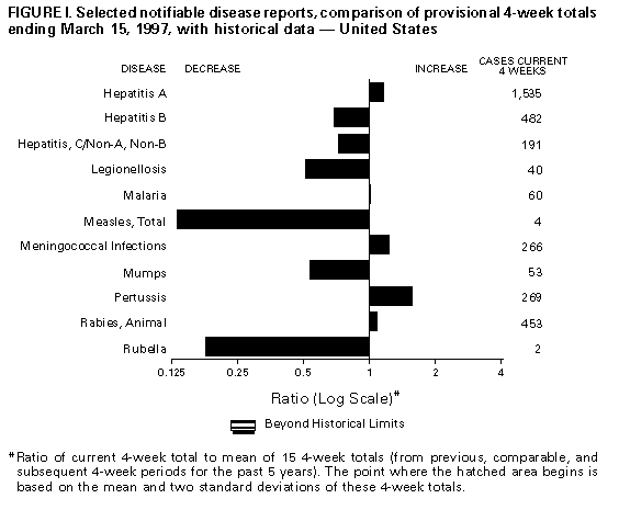 Persons using assistive technology might not be able to fully access information in this file. For assistance, please send e-mail to: mmwrq@cdc.gov. Type 508 Accommodation and the title of the report in the subject line of e-mail. Notifiable Diseases/Deaths in Selected Cities Weekly InformationFigure_I Selected notifiable disease reports, comparison of provisional 4-week totals ending March 15, 1997, with historical data -- United States Table_I Summary -- provisional cases of selected notifiable diseases, United States, cumulative, week ending March 15, 1997 (11th Week) Table_II Provisional cases of selected notifiable diseases, United States, weeks ending March 15, 1997 and March 16, 1996 (11th Week) Table_III Provisional cases of selected notifiable diseases preventable by vaccination, United States, weeks ending March 15, 1997 and March 16, 1996 (11th Week) Table_IV Deaths in 122 U.S. cities, week ending