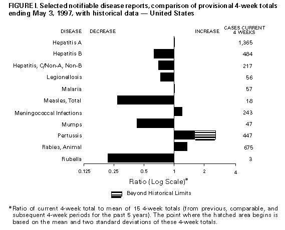 Persons using assistive technology might not be able to fully access information in this file. For assistance, please send e-mail to: mmwrq@cdc.gov. Type 508 Accommodation and the title of the report in the subject line of e-mail. Notifiable Diseases/Deaths in Selected Cities Weekly InformationFigure_I Selected notifiable disease reports, comparison of provisional 4-week totals ending May 3, 1997, with historical data -- United States Table_I Summary -- provisional cases of selected notifiable diseases, United States, cumulative, week ending May 3, 1997 (18th Week) Table_II Provisional cases of selected notifiable diseases, United States, weeks ending May 3, 1997 and May 4, 1996 (18th Week) Table_III Provisional cases of selected notifiable diseases preventable by vaccination, United States, weeks ending May 3, 1997 and May 4, 1996 (18th Week) Table_IV Deaths in 122 U.S. cities, week ending