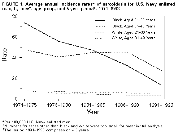 Persons using assistive technology might not be able to fully access information in this file. For assistance, please send e-mail to: mmwrq@cdc.gov. Type 508 Accommodation and the title of the report in the subject line of e-mail. Sarcoidosis Among U.S. Navy Enlisted Men, 1965-1993Sarcoidosis is a multisystem granulomatous disease of unknown etiology with highest incidence among young and middle-aged adults. In the United States, the risk for sarcoidosis is substantially higher among blacks than among other races (1,2); however, the reasons for this association are unknown. In response to the occurrence of a case of sarcoidosis in a U.S. Navy (USN) enlisted man, CDC's National Institute for Occupational Safety and Health (NIOSH) analyzed USN data on cases of sarcoidosis diagnosed among active-duty enlisted personnel during 1965-1993. This report summarizes the findings of this analysis, which indicate that the incidence of sarcoidosis declined among USN enlisted men during 1965-1993, particularly among blacks, and that the risk for sarcoidosis was statistically associated with the assignment of USN enlisted men to aircraft carriers. In 1974, a 21-year-old black enlisted man had sarcoidosis diagnosed based on a chest radiograph indicating bilateral hilar adenopathy without parenchymal disease; noncaseating granulomata were present on lymph node biopsy. He had a history of shortness of breath, cough, and chest and joint pain, which he related to his work of grinding antiskid materials from aircraft carrier decks during the preceding 2 years. He received a medical discharge for sarcoidosis in 1975. In 1987, physicians at the U.S. Department of Veterans Affairs diagnosed pneumoconiosis in this patient after mineral-dust deposits were identified in a lung biopsy; the mineral-dust deposits were attributed to the same work exposures aboard the aircraft carrier. In October 1992, the patient asked the USN to request NIOSH to investigate whether his sarcoidosis diagnosis and other cases diagnosed in persons with whom he had served in the USN may have been associated with environmental exposures during their USN service. Because of the possibility of an association between risk for sarcoidosis-like illnesses and environmental exposures during service in the USN and because the underlying cause(s) of sarcoidosis is unknown, in December 1992 the USN requested that NIOSH evaluate the potential relation between sarcoidosis and the USN work environment. NIOSH obtained records from the U.S. Naval Health Research Center (NHRC) for all incident cases of sarcoidosis (defined as diagnosis of "sarcoidosis" by a USN health-care provider) identified among white and black enlisted men while on active duty at any time from 1965 through 1993 * (n=1121). Incidence rates were calculated using age-specific total denominator data for white and black enlisted men on active duty from 1971 through 1993 (denominator data were unavailable for the years before 1971). Numbers for other races were too small for meaningful analysis (no more than three incident cases of sarcoidosis were diagnosed among persons in any other racial category); women were excluded because none had been assigned to aircraft carriers -- an exposure of particular a priori interest -- during 1965-1993. During 1971-1993, the average annual age-specific incidence rate for sarcoidosis declined substantially among USN enlisted black men aged 21-30 years, from 73.3 per 100,000 to 13.2 per 100,000 (Figure_1). Rates for enlisted black men aged 31-40 years declined from 46.5 to 27.8, primarily during 1991-1993. During 1971-1993, rates for USN enlisted white men remained relatively stable. To provide a basis for comparison with cases, a random sample of 10,000 controls was obtained from the NHRC records of enlisted personnel on active duty at any time during 1965-1993; of these, 9040 fulfilled the selection criteria of being men and either white or black. During this period (1965-1993), blacks accounted disproportionately for cases (47.8% of cases versus 11.4% of controls); in addition, USN men with sarcoidosis had served in the USN approximately twice as long as controls (mean tenure was 10.7 years {standard error (SE)=plus or minus 0.2 years} versus 5.5 years {SE=plus or minus 0.1 year}, respectively) and had entered USN service an average of 5 years earlier (1971 {SE=plus or minus 0.3} versus 1976 {SE=plus or minus 0.1}, respectively). Of the enlisted men in whom sarcoidosis had been diagnosed, 27% were discharged within 1 year of diagnosis. Because specific codes for ship type and land assignment were generally not available until 1971, comparisons involving these variables were restricted to the 426 persons classified as cases and 4377 persons classified as controls who entered the USN after that date. Although 70% of case-patients and 66% of controls had ever served on ships, 26% of case-patients and 17% of controls had ever served specifically on aircraft carriers. Additional analyses were conducted to examine the possible association of sarcoidosis with ship service and to control for potential confounders and investigate possible effect modification. For each case, a risk set was created that comprised all persons who had been born during the same 5-year period and who had survived without sarcoidosis beyond the age at which the corresponding case-patient had sarcoidosis diagnosed. Within each risk set, work history in the USN was truncated for persons in the control group when they reached the age at which their corresponding case-patient had sarcoidosis diagnosed. Cox regression with age as the time variable was conducted to examine associations between a USN diagnosis of sarcoidosis and the following variables: race, entry period of USN enlistment, type of ship assignment, and region of country where enlisted. ** Region of enlistment was investigated because previous studies identified it as a predictor of sarcoidosis (1). The analysis indicated a s