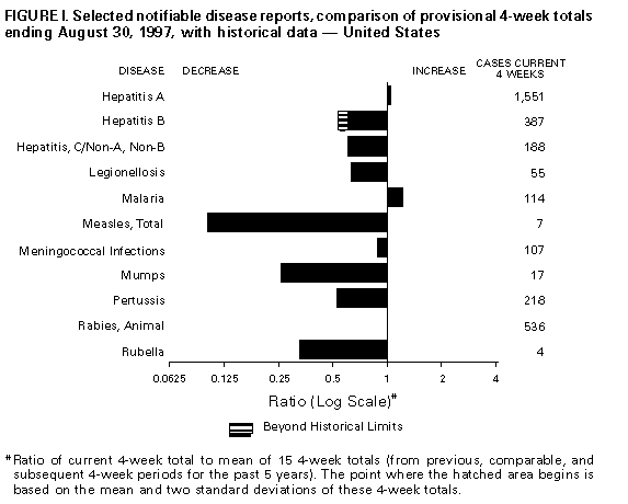 Persons using assistive technology might not be able to fully access information in this file. For assistance, please send e-mail to: mmwrq@cdc.gov. Type 508 Accommodation and the title of the report in the subject line of e-mail. Notifiable Diseases/Deaths in Selected Cities Weekly InformationFigure_I Selected notifiable disease reports, comparison of provisional 4-week totals ending August 30, 1997, with historical data -- United States Table_I Summary -- provisional cases of selected notifiable diseases, United States, cumulative, week ending August 30, 1997 (35th Week) Table_II Provisional cases of selected notifiable diseases, United States, weeks ending August 30, 1997 and August 31, 1996 (35th Week) Table_III Provisional cases of selected notifiable diseases preventable by vaccination, United States, weeks ending August 30, 1997 and August 31, 1996 (35th Week) Table_IV Deaths in 122 U.S. cities, week ending