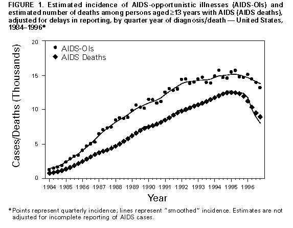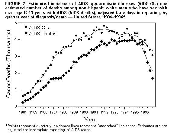 Persons using assistive technology might not be able to fully access information in this file. For assistance, please send e-mail to: mmwrq@cdc.gov. Type 508 Accommodation and the title of the report in the subject line of e-mail. Update: Trends in AIDS Incidence -- United States, 1996Provisional surveillance data about acquired immunodeficiency syndrome (AIDS) for the first 6 months of 1996 indicated a decrease in deaths among persons with AIDS, attributed primarily to the effect of antiretroviral therapies on the survival of persons infected with human immunodeficiency virus (HIV) (1). This report describes a decline in AIDS incidence during 1996 compared with 1995 and the continued decline in AIDS deaths; the findings indicate that HIV therapies are having a widespread beneficial impact on the rate of HIV disease progression in the United States. * Cumulative AIDS cases among persons aged greater than or equal to 13 years reported to CDC through June 1997 from the 50 states, the District of Columbia, and the U.S. territories were analyzed by sex, age, race/ethnicity, and mode of risk/exposure ** (2). Estimates of AIDS incidence and deaths were adjusted for delays in reporting. For analyses by risk/exposure, estimates were adjusted for the anticipated reclassification of cases initially reported without an HIV risk/exposure (2). To adjust for the 1993 expansion of the AIDS reporting criteria ***, estimates of the incidence of AIDS-opportunistic illnesses (AIDS-OIs) were calculated from the sum of cases reported with an AIDS-OI and cases with estimated dates of diagnosis of an AIDS-OI that were reported based only on immunologic criteria (2). AIDS-OI incidence was estimated quarterly through December 1996 (the most recent period for which reliable estimates were available). Deaths among persons with AIDS were identified by review of medical records and death certificates and represent both deaths from HIV-related and other causes. AIDS prevalence was estimated as the cumulative incidence of AIDS based on the 1993 expanded AIDS case criteria minus cumulative deaths. Populations with less than 500 estimated cases were excluded because the estimates of annual percentage change from 1995 to 1996 in AIDS-OI incidence, deaths, and prevalence are not reliable. AIDS-OI Incidence During 1996, AIDS-OIs were diagnosed in an estimated 56,730 persons, a decline of 6% compared with 1995 (Figure_1). This represents the first calendar year during which AIDS-OI incidence overall did not increase in the United States. From 1995 to 1996, AIDS-OI incidence declined in all four geographic regions of the United States (West {12%}, Midwest {10%}, Northeast {8%}, and South {1%}) ****. AIDS-OI incidence decreased in all 5-year age groups; men; non-Hispanic whites and Hispanics; men who have sex with men (MSM); injecting-drug users (IDUs); and men who reported both of these exposures (MSM-IDUs) (Table_1). The largest proportionate declines occurred among non-Hispanic white MSM (Figure_2) and non-Hispanic white and black MSM-IDUs (Table_2). AIDS-OI incidence leveled among non-Hispanic blacks. The greatest proportionate increases in AIDS-OI incidence occurred among non-Hispanic black men (19%), Hispanic men (13%), and non-Hispanic black women (12%) who had heterosexual risk/exposures (Table_2). From 1995 to 1996, annual AIDS incidence changed abruptly compared with the magnitude and direction of the average annual changes in AIDS-OI incidence during 1992-1995. During these years, AIDS-OI incidence increased but was characterized by a slowing in the growth of the epidemic overall (average annual change from 1992 to 1995 was 2%) (1,2). The magnitude and/or the direction of the average annual change in AIDS-OI incidence from 1992 to 1995 was substantially different from the change from 1995 to 1996 among men (1% versus -8%) and women (10% versus 2%); whites (-2% versus -13%), non-Hispanic blacks (7% versus 0), and Hispanics (4% versus -5%); MSM (-1% versus -11%), men and women IDUs (3% versus -6% and 5% versus -4% , respectively), and MSM-IDUs (-3% versus -15%). Deaths Among Persons Reported with AIDS Deaths among persons reported with AIDS declined 23% in 1996 compared with 1995, with the largest declines occurring during the last three quarters of 1996 (Figure_1). From 1995 to 1996, deaths declined in all four geographic regions (West {33%}, Midwest {25%}, Northeast {22%}, and South {19%}); among men and women; among all racial/ethnic groups; and in all risk/exposure categories (Table_1). AIDS Prevalence Approximately 235,470 persons in whom AIDS has been diagnosed are still living, and from 1995 to 1996, the prevalence of AIDS increased 11% (Table_3). MSM accounted for the largest proportion (48%) of persons with AIDS, and the largest proportionate increases in prevalence occurred among men and women who acquired AIDS through heterosexual contact (28% and 23%, respectively), the only risk/exposure category that experienced increases in AIDS-OI incidence. Reported by: State and local health depts. Div of HIV/AIDS Prevention-Surveillance and Epidemiology, National Center for HIV, STD, and TB Prevention, CDC. Editorial NoteEditorial Note: The findings in this report document the first overall decline in the annual incidence of AIDS-OIs in the United States. Concurrently, annual deaths among persons aged greater than or equal to 13 years reported with AIDS also have decreased. Temporal trends in AIDS cases and deaths are the result of changes in the rate of new HIV infections, AIDS diagnoses resulting from progression of HIV disease to AIDS, and deaths of HIV- infected persons. The declines in AIDS-OI incidence and deaths reflect the impact of both HIV prevention efforts and the use of antiretroviral therapies and AIDS-OI prophylaxis. During 1996, AIDS-OI incidence declined for almost all populations and in all regions of the country, and deaths declined substantially (23%) compared with 1995. The actual decline in AI