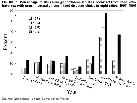 Persons using assistive technology might not be able to fully access information in this file. For assistance, please send e-mail to: mmwrq@cdc.gov. Type 508 Accommodation and the title of the report in the subject line of e-mail. Gonorrhea Among Men Who Have Sex with Men -- Selected Sexually Transmitted Diseases Clinics, 1993-1996Among men who have sex with men (MSM), gonorrhea trends may reflect changes in sexual behaviors that also influence risk for human immunodeficiency virus (HIV) infection (1). Data from the Gonococcal Isolate Surveillance Project (GISP) were used to assess trends in gonococcal infection (GC) among MSM. For the subset of GISP sites where a substantial proportion of GC cases were in MSM, a special survey of the local areas was conducted to describe factors associated with GC in MSM. This report summarizes the results of that survey, which indicate that the number and proportion of MSM diagnosed with GC has increased in the sexually transmitted diseases (STD) clinics of several large cities in the United States. GISP is a sentinel surveillance project begun in 1987 to monitor antimicrobial resistance in Neisseria gonorrhoeae. Through GISP, STD clinics in 26 U.S. cities collect gonococcal isolates and clinical information, including sexual orientation, from the first 20 male patients with urethral GC examined each month. The sexual orientation of GISP participants examined from 1993 through 1996 was analyzed, and surveys were conducted of the clinics where greater than 5% of GISP isolates over the 4-year period were from MSM (n=8) *. The survey collected information from locally available data about absolute numbers of GC cases in MSM, in contrast to the proportions that were available from GISP data. The survey also addressed overall gonorrhea and other STD (i.e., nongonococcal urethritis {NGU}) trends and factors that could be associated with GC trends in MSM (i.e., changes in clinic practices, geographic clustering of cases, sexual risk behaviors, illicit drug use, and HIV serostatus). MSM comprised 5.0% of all cases in the GISP sample in 1993, a proportion similar to preceding years, and 8.7% in 1996 (p less than 0.001). Among the subset of eight GISP clinics where greater than 5% of isolates were obtained from MSM, the proportion increased from 12.0% (range: 4.2%-35.1%) in 1993 to 23.5% (range: 7.2%-57.1%) in 1996 (p less than 0.001) (Figure_1). The median age of MSM reported from all 26 clinics was 30 years and remained stable from 1993 through 1996. Changes in the race/ethnicity distribution were not statistically significant: from 1993 to 1996, the percentage of MSM who were white increased from 58.6% to 64.9%, and the percentage who were black decreased from 23.0% to 17.4%. Clinics in San Francisco; Seattle; and Portland, Oregon, experienced increases in both the absolute number and proportion of gonorrhea cases among MSM. From 1994 to 1996, GC among MSM at the Seattle clinic increased 125% (from 51 cases to 115 cases), while clinic visits by MSM increased by 17%. During the same period, the proportion of positive rectal and pharyngeal GC cultures among MSM at the Seattle clinic increased from 5.0% to 8.0% and from 1.5% to 6.7%, respectively. From 1994 to 1995 at the San Francisco clinic, the absolute number of MSM with GC increased 24% (from 271 to 336); similar increases occurred in the number of GC cases identified from a neighborhood known to have a high concentration of MSM and in the number of rectal GC cases. From 1995 to 1996 at the Portland clinic, the number of MSM with GC increased 124% (from 33 cases to 74 cases). Clinic visits by MSM during the same period increased, but the number of MSM seen by the clinic decreased, indicating that the increase in GC cases did not result from an increase in the number of MSM served by the clinic. Enhanced GC screening efforts targeted to MSM were initiated in San Francisco in early 1996, potentially contributing to an increase in reported cases in 1996; however, the absolute number of cases of GC in 1996 were not available at the time of this report. Changes in screening or outreach to MSM were not identified at other clinics in this survey. In addition, none of the clinics surveyed were aware of any changes in the availability of clinical services that might have prompted MSM to shift STD care-seeking from other venues to public STD clinics. From 1994 to 1996, NGU increased 27% among MSM at the Seattle clinic and 40% among MSM at the San Francisco clinic from 1993 to 1995. Approximately one fourth of MSM with GC identified at the Seattle and Portland clinics and one fourth of all MSM examined at the San Francisco clinic were HIV positive. Of the remaining five clinics surveyed, those in Honolulu and San Diego reported substantial increases in the number of MSM with GC. In San Diego, from 1996 to the first quarter of 1997, the proportion of rectal specimens that were positive for N. gonorrhoeae increased from 3.9% (seven of 180) to 14.6% (six of 41), and the proportion of male pharyngeal cultures that were positive increased from 2.9% (15 of 522) to 4.0% (five of 125). Based on five interviews of MSM with GC, four also were HIV infected. At the Denver clinic, the absolute number of MSM with GC decreased despite an increase in the proportion of GC cases identified in MSM from 1995 to 1996. In comparison with other clinics surveyed, the Denver clinic observed an increase in the number of black MSM examined from 1995 to 1996. The Long Beach and Orange County, California, clinics are investigating local trends in GC among MSM. Reported by: W Whittington, Univ of Washington; S Desmon, Seattle-King County Dept of Public Health, Seattle. C Kent, R Kohn, San Francisco Dept of Public Health, San Francisco; T Brazell, MD, San Diego Dept of Health Svcs, San Diego; JM Montes, STD Control Br, California Dept of Health Svcs. D Harger, V Fox, Oregon Health Div. R Ohye, Hawaii Dept of Health. FN Judson, MD, Denver Dept of He