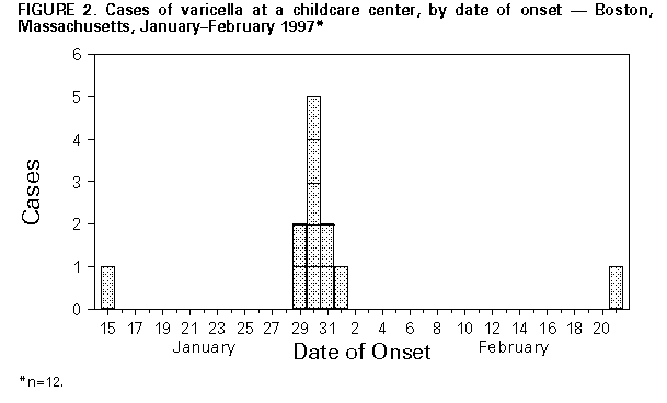 Persons using assistive technology might not be able to fully access information in this file. For assistance, please send e-mail to: mmwrq@cdc.gov. Type 508 Accommodation and the title of the report in the subject line of e-mail. Outbreak of Invasive Group A Streptococcus Associated with Varicella in a Childcare Center -- Boston, Massachusetts, 1997Group A Streptococcus (GAS) causes common childhood diseases such as streptococcal pharyngitis and impetigo and can cause severe, life-threatening invasive disease including streptococcal toxic-shock syndrome and necrotizing fasciitis. Invasive GAS disease occurs when GAS infects a normally sterile site. Clusters of invasive GAS infection previously had not been reported among children in school or childcare centers (CCCs). However, on February 13, 1997, the Boston Public Health Commission received reports of cases of concurrent invasive GAS and varicella infection among two of 14 children in the same CCC classroom. Because of the potential for further spread of invasive disease, the Boston Public Health Commission initiated an investigation of these cases. This report describes the findings of the investigation, including risk factors for infection, and recommended prevention measures. The findings indicate the potential for widespread GAS infection and carriage in CCCs and suggest that, in this outbreak, antecedent use of varicella vaccine would have prevented cases of invasive GAS. Case Descriptions On February 2, a previously healthy 4-year-old girl (patient who had had onset of varicella on January 30 was taken to a local hospital because of swelling, tenderness, warmth, and redness over her left upper arm and shoulder. Purulent skin lesions were not present, and a blood culture was negative. The patient was admitted to the hospital with a diagnosis of cellulitis and received intravenous clindamycin, but her symptoms did not improve. She underwent surgical exploration for possible necrotizing fasciitis and subsequently received a total fasciotomy of her left arm. Cultures of tissue specimens obtained at surgery grew GAS, serotype M1T1. On February 6, submental abscess was diagnosed in a 3-year-old classmate of patient 1 (patient 2), 7 days after onset of varicella infection. No obviously infected lesions were located over or near the abscess, and a blood culture was negative. The abscess was incised and drained, and contents grew GAS, serotype M1T1. Investigation of the CCC In February 1997, a total of 39 children aged 1-4 years were enrolled in the CCC. The children were divided into three classrooms by age group, and groups were separated throughout the day except for 2 hours of outdoor play. To assess the prevalence of GAS carriage associated with the CCC, during February 17-19 throat swab specimens were obtained from all children attending the CCC, their household contacts, and all CCC employees. Cases of GAS infection were identified by review of hospital records and telephone interviews with physicians. Four case definitions were used to categorize GAS status: a case of invasive GAS infection was defined as isolation of GAS from a normally sterile site; a case of noninvasive GAS infection was defined as identification of GAS from the throat of an ill person (strep throat) either by rapid-antigen test or culture; a case of possible GAS infection was defined as identification of a clinical illness commonly caused by GAS; and a case of GAS carriage was defined as isolation of GAS from the throat culture of a well person. Of the 14 classmates of patients 1 and 2, three had strep throat, and two had GAS carriage. Two of three available isolates (one obtained from a child with strep throat and one from a carrier of GAS) were serotype M1T1. In addition, two cases of possible GAS infection were identified: one with an infected varicella lesion and the other with leg cellulitis; however, cultures were not obtained from the lesions (Figure_1). Of the 25 children in other classrooms, one had scarlet fever, serotype M1T1, and one was a carrier of GAS of another serotype. Of the 92 household contacts, three had strep throat, and their isolates were not available for serotyping. GAS carriage was present in two persons (one was serotype M1T1 and the other was a different serotype). Of the 13 CCC workers, GAS carriage, not M1T1, was present in one person. The child with scarlet fever and the household contact carrier of serotype M1T1 were both siblings of classmates of patients 1 and 2. Identification of Risk Factors for Infection Risk factors for GAS infection among classmates of patients 1 and 2 were identified from responses by parents on self-administered written questionnaires. All nine cases of test-confirmed (by culture or rapid-antigen test) and possible GAS infection occurred in persons with varicella infection. Of the 14 classmates of patients 1 and 2, a total of 12 were susceptible to varicella at the start of the school year: one had a previous history of varicella, and one had been vaccinated against varicella. The first case of varicella occurred on January 15; of the other 11 susceptible children, 10 had onsets of varicella during January 29-February 1 (Figure_2). Of these, seven were identified with GAS infection or carriage, and two had onset of possible GAS disease 3-14 days following onset of varicella. Of the 11 children who were not receiving antibiotics and whose GAS status was test-confirmed, seven who spent greater than 30 hours per week at the CCC had documented GAS infection or carriage compared with none of the four children who spent less than or equal to 30 hours (Fisher's exact test, p less than 0.01). A total of 112 environmental surfaces were cultured to assess the possible role of fomites in disease transmission. These surfaces included handles and other sites that a child was likely to grip (70) and any toy (e.g., toy food and phones) that a child was likely to place in his or her mouth (42). Of the 112 samples, s
