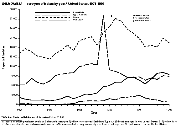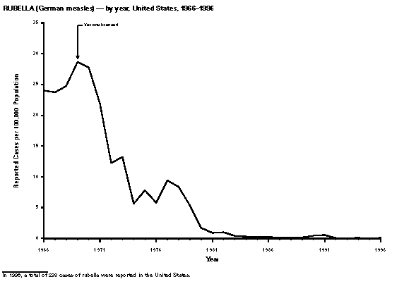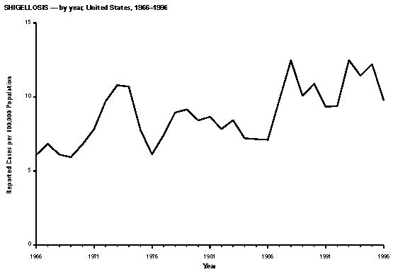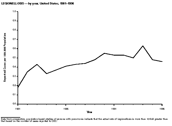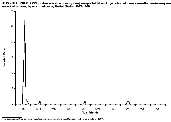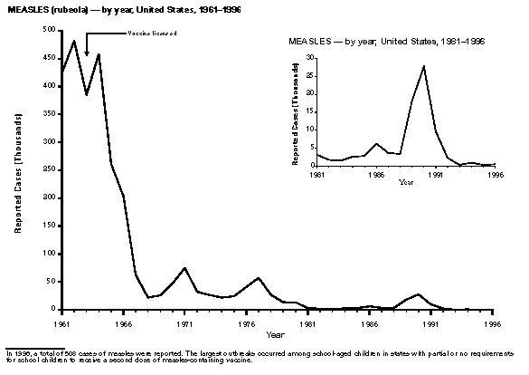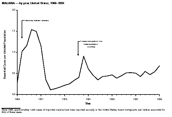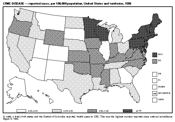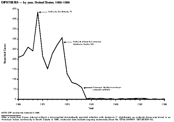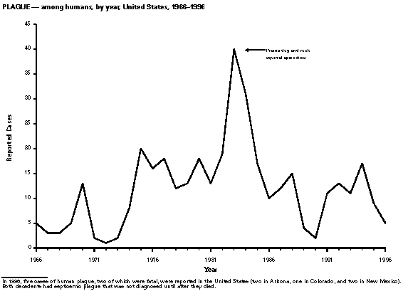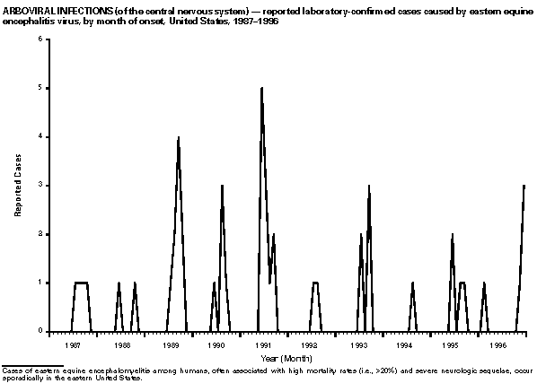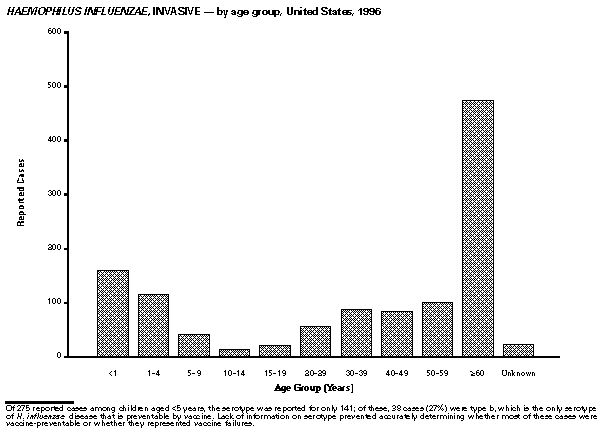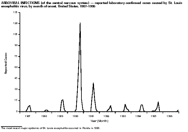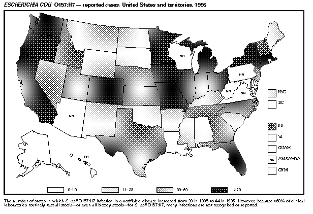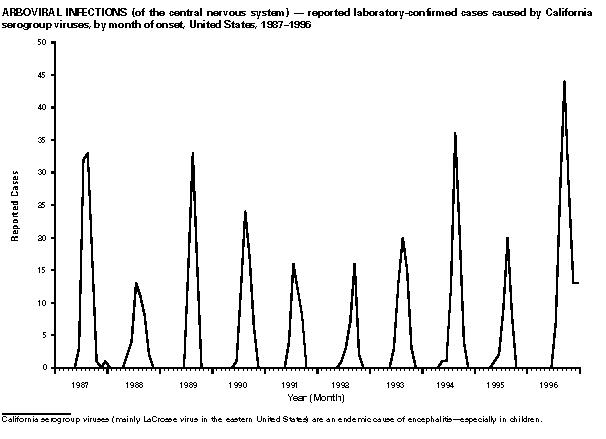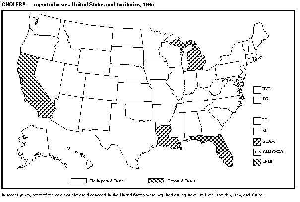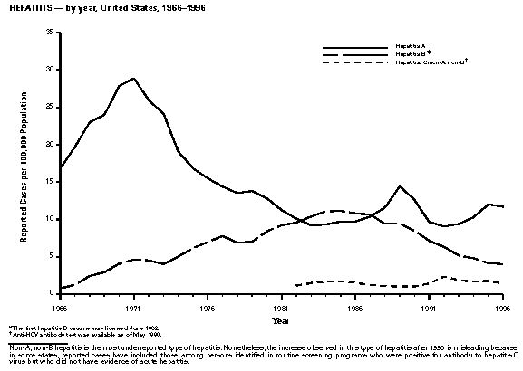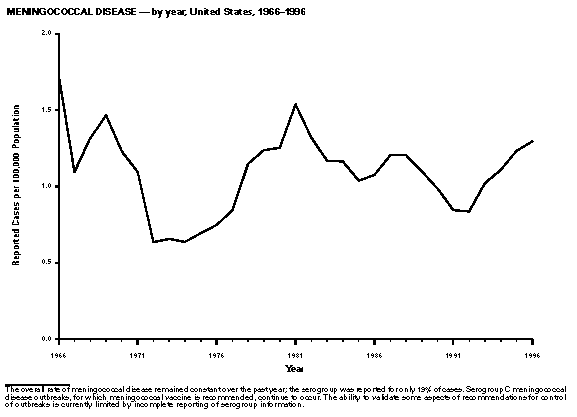 Persons using assistive technology might not be able to fully access information in this file. For assistance, please send e-mail to: mmwrq@cdc.gov. Type 508 Accommodation and the title of the report in the subject line of e-mail. Summary of Notifiable Diseases, United States 1996The following CDC staff members contributed to this report: Myra A. Montalbano Carol M. Knowles Deborah A. Adams Patsy A. Hall Robert F. Fagan Karl A. Brendel Harry R. Holden Gerald F. Jones Division of Public Health Surveillance and Informatics Epidemiology Program Office in collaboration with Willie J. Anderson Office of the Vice President for Health Affairs Emory University Angela Trosclair, M.S. TRW, Inc. Siobhan M. Gilchrist, M.P.H. Klemm Analysis Group Felicia J. Perry MCA Research Corporation Foreword MMWR Summary of Notifiable Diseases, United States, 1996 This publication contains summary tables of the official statistics for the reported occurrence of nationally notifiable diseases in the United States for 1996. These statistics are collected and compiled from reports to the National Notifiable Diseases Surveillance System (NNDSS), which is operated by CDC in collaboration with the Council of State and Territorial Epidemiologists (CSTE). Because the dates of onset and dates of diagnosis for notifiable diseases may not always be reported, these surveillance data are presented by the week that they were reported to CDC by public health officials in state and territorial health departments. These data are finalized and published in the MMWR Summary of Notifiable Diseases, United States for use by state and local health departments; schools of medicine and public health; communications media; local, state, and federal agencies; and other agencies or persons interested in following the trends of reportable diseases in the United States. The annual publication of the Summary also documents which diseases are considered national priorities for notification and the annual number of cases of such diseases. Part 1 contains information regarding morbidity for each of the diseases considered nationally notifiable during 1996. The tables provide the number of cases of notifiable diseases reported to CDC for 1996, as well as the distribution of cases by month and geographic location, and by patient's age, sex, race, and Hispanic ethnicity. The data are final totals as of July 25, 1997, unless otherwise noted. Because no cases of anthrax were reported in the United States during 1996, this nationally notifiable disease does not appear in the tables in Part 1. Nationally notifiable diseases that are reportable in fewer than 40 states also do not appear in these tables. In all tables, leprosy is listed as Hansen disease, and tick-borne typhus fever is listed as Rocky Mountain spotted fever (RMSF). Part 2 contains graphs and maps. These graphs and maps depict summary data for many of the notifiable diseases that are described in tabular form in Part 1. Part 3 includes tables that list the number of cases of notifiable diseases reported to CDC since 1967. It also includes a table enumerating deaths associated with specified notifiable diseases reported to the National Center for Health Statistics, CDC, during 1986-1995. Background As of January 1, 1996, 52 infectious diseases were designated as notifiable at the national level. A notifiable disease is one for which regular, frequent, and timely information regarding individual cases is considered necessary for the prevention and control of the disease. This section briefly summarizes the history of the reporting of nationally notifiable diseases in the United States. In 1878, Congress authorized the U.S. Marine Hospital Service (i.e., the forerunner of the Public Health Service {PHS}) to collect morbidity reports regarding cholera, smallpox, plague, and yellow fever from U.S. consuls overseas; this information was to be used for instituting quarantine measures to prevent the introduction and spread of these diseases into the United States. In 1879, a specific Congressional appropriation was made for the collection and publication of reports of these notifiable diseases. The authority for weekly reporting and publication of these reports was expanded by Congress in 1893 to include data from states and municipal authorities. To increase the uniformity of the data, Congress enacted a law in 1902 directing the Surgeon General to provide forms for the collection and compilation of data and for the publication of reports at the national level. In 1912, state and territorial health authorities -- in conjunction with PHS -- recommended immediate telegraphic reporting of five infectious diseases and the monthly reporting, by letter, of 10 additional diseases. The first annual summary of The Notifiable Diseases in 1912 included reports of 10 diseases from 19 states, the District of Columbia, and Hawaii. By 1928, all states, the District of Columbia, Hawaii, and Puerto Rico were participating in national reporting of 29 specified diseases. At their annual meeting in 1950, the State and Territorial Health Officers authorized a conference of state and territorial epidemiologists whose purpose was to determine which diseases should be reported to PHS. In 1961, CDC assumed responsibility for the collection and publication of data concerning nationally notifiable diseases. The list of nationally notifiable diseases is revised periodically. For example, a disease may be added to the list as a new pathogen emerges, or a disease may be deleted as its incidence declines. Public health officials at state health departments and CDC continue to collaborate in determining which diseases should be nationally notifiable; CSTE, with input from CDC, makes recommendations annually for additions and deletions to the list of nationally notifiable diseases. However, reporting of nationally notifiable diseases to CDC by the states is voluntary (for a complete list of all nationally reportable infectious
