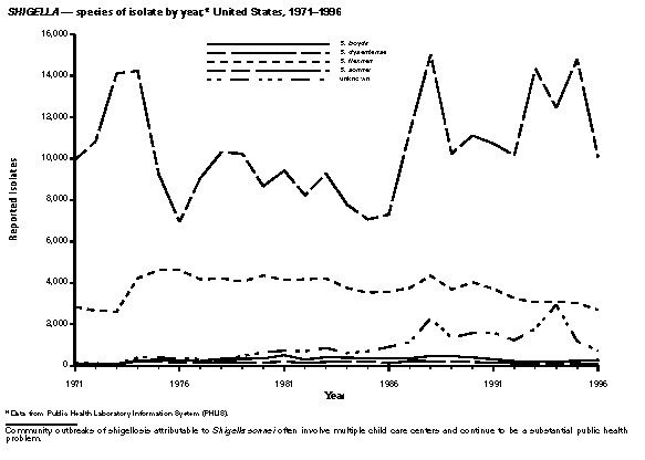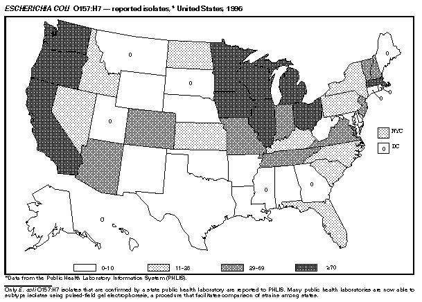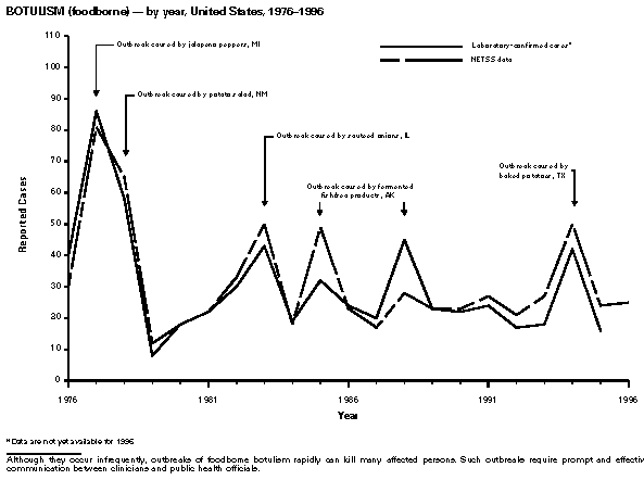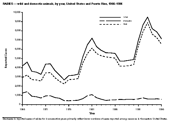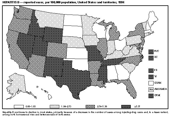 Data Sources Provisional data concerning the reported occurrence of notifiable diseases are published weekly in MMWR. After each reporting year, staff in state health departments finalize reports of cases for that year with local or county health departments and reconcile the data with reports previously sent to CDC throughout the year; these data are compiled in final form in this summary. Notifiable disease reports (which are published in the annual MMWR Summary of Notifiable Diseases only after approval by the appropriate epidemiologist from each submitting state or territory) are the authoritative and archival counts of cases. Data published in MMWR Surveillance Summaries or other surveillance reports produced by CDC programs, which are useful for detailed epidemiologic analyses, may not agree exactly with data reported in the annual Summary of Notifiable Diseases because of differences in the timing of reports, the source of the data, and the use of different case definitions. Data in this summary were derived primarily from reports transmitted to the Division of Public Health Surveillance and Informatics, Epidemiology Program Office, CDC, by the 50 state, two city, and five territorial health departments through the National Electronic Telecommunications System for Surveillance (NETSS). (For more information regarding NETSS and notifiable diseases, including case definitions for these conditions, see World-Wide Web site http://www.cdc.gov/epo/phs.htm.) Final data for other diseases are from the surveillance-program records of the following CDC programs (requests for further information regarding these data should be directed to the source specified): National Center for Health Statistics ------------------------------------- Office of Vital and Health Statistics Systems (deaths from selected notifiable diseases) National Center for Infectious Diseases --------------------------------------- Division of Bacterial and Mycotic Diseases (toxic-shock syndrome and laboratory data regarding botulism, Escherichia coli O157:H7, Salmonella, and Shigella) Division of Vector-Borne Infectious Diseases (laboratory data regarding arboviral encephalitis) Division of Viral and Rickettsial Diseases (animal rabies) National Center for HIV, STD, and TB Prevention (NCHSTP) -------------------------------------------------------- Division of HIV/AIDS Prevention, Surveillance, and Epidemiology (acquired immunodeficiency syndrome {AIDS}) Division of Sexually Transmitted Diseases Prevention (chancroid, chlamydia, gonorrhea, and syphilis) Division of Tuberculosis Elimination (tuberculosis) National Immunization Program ----------------------------- Epidemiology and Surveillance Division (poliomyelitis) Disease totals for the United States, unless otherwise stated, do not include data for American Samoa, Guam, Puerto Rico, the Virgin Islands, and the Commonwealth of the Northern Mariana Islands (CNMI). Disease totals from American Samoa were unavailable for 1996. Population estimates for states are based on the July 1, 1996, post-censal estimates made by the U.S. Department of Commerce, Bureau of the Census, Population Division, Population Estimates Branch, PPL-57. Because these estimates are unavailable by age and sex for 1996, rates for reported disease occurrences by age group and among males and females use population totals from the 1995 post-censal estimates. Population estimates for territories are from the 1990 census, U.S. Department of Commerce, Bureau of the Census, Press Releases CB91-142, 242, 243, 263, and 276. Rates in the 1996 Summary of Notifiable Diseases were based on data for the U.S. total-resident population. However, population data from states in which diseases were not notifiable or disease data were not available were excluded from rate calculations. Interpreting Data The data reported in this summary are useful for analyzing disease trends and determining relative disease burdens. However, these data must be interpreted in light of reporting practices. Some diseases that cause severe clinical illness (e.g., plague or rabies), if diagnosed by a clinician, are most likely reported accurately. However, persons who have diseases that are clinically mild and infrequently associated with serious consequences (e.g., salmonellosis) may not even seek medical care from a health-care provider; even if these less severe diseases are diagnosed, they are less likely to be reported. The degree of completeness of reporting also is influenced by the diagnostic facilities that are available; the control measures that are in effect; the public awareness of a specific disease; and the interests, resources, and priorities of state and local officials responsible for disease control and public health surveillance. Finally, factors such as changes in the case definitions for public health surveillance, the introduction of new diagnostic tests, or the discovery of new disease entities may cause changes in disease reporting that are independent of the true incidence of disease. Public health surveillance data are published for selected racial and ethnic population groups because these variables may be risk markers for certain notifiable diseases. Risk markers can identify potential risk factors for investigation in future studies. Data regarding race and ethnicity also can be useful for identifying groups to target for prevention efforts. However, caution must also be used when drawing conclusions from reported data relating to race and ethnicity. Among persons of certain races and ethnicities, there are likely to be differential patterns of access to health care, interest in seeking health care, and detection of disease that would lead to data that are not representative of disease incidence in these populations. In addition, not all data concerning race and ethnicity are collected uniformly for all diseases. For example, the Division of HIV/AIDS Prevention, Surveillance, and Epidemiology and the Division