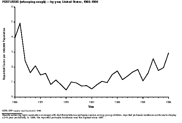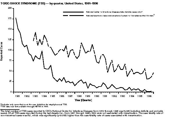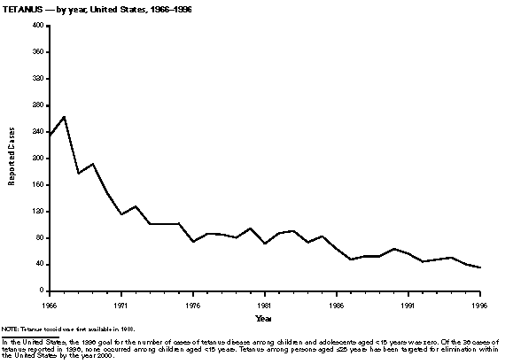Coles BF, Hipp SS, Silberstein GS, Chen JH. Congenital syphilis surveillance in upstate New York, 1989-1992: implications for prevention and clinical management. J Infect Dis 1995;171:732-5. Risser WL, Hwang LY. Problems in the current case definitions of congenital syphilis. J Pediatr 1996;129:499-505. Tetanus Izurieta HS, Sutter RW, Strebel PM, et al. Tetanus surveillance -- United States 1991-1994. MMWR 1997;46(No. SS-2):15-25. Gergen PJ, McQuillan GM, Kiely M, Ezzati-Rice TM, Sutter RW, Virella G. A population-based serologic survey of immunity to tetanus in the United States. N Engl J Med 1995;332:761-6. Prevots R, Sutter R, Strebel PM, Cochi S, Hadler S. Tetanus surveillance -- United States, 1989-1990. MMWR 1992;41(No. SS-8):1-9. Sutter RW, Cochi SL, Brink EW, Sirotkin BI. Assessment of vital statistics and surveillance data for monitoring tetanus mortality, United States, 1979-1984. Am J Epidemiol 1990;131:132-42. Toxic-shock syndrome CDC. Reduced incidence of menstrual toxic shock syndrome -- United States, 1980-1990. MMWR 1990;39:421-3. Gaventa S, Reingold AL, Hightower AW, et al. Active surveillance for toxic shock syndrome in the United States, 1986. Rev Infect Dis 1989;11 (suppl.):S28-S34. Schuchat A, Broome CV. Toxic shock syndrome and tampons. Epidemiol Rev 1991;13:99-112. Trichinosis CDC. Trichinosis surveillance -- United States, 1987-1990. MMWR 1991;40 (No. SS-3):35-42. McAuley JB, Michelson MK, Hightower AW, Engeran S, Wintermeyer LA, Schantz PM. A trichinosis outbreak among Southeast Asian refugees. Am J Epidemiol 1992;135:1404-10. CDC. Outbreak of trichinellosis associated with eating cougar jerky -- Idaho, 1995. MMWR 1996;45:205-6. Schantz PM, Moore AC, Munoz JM, et al. Neurocysticercosis in an orthodox Jewish community in New York City. N Engl J Med 1992;327:692-5. Tuberculosis American Thoracic Society, CDC. Treatment of tuberculosis and tuberculosis infection in adults and children. Am J Respir Crit Care Med 1994;149: 1359-74. CDC. Recommendations for counting reported tuberculosis cases. In: Reported tuberculosis in the United States, 1996. July 1997:61-8. CDC. Tuberculosis morbidity -- United States, 1996. MMWR 1997;46:695-700. Typhoid fever CDC. Typhoid immunization: recommendations of the Advisory Committee on Immunization Practices. MMWR 1994;43(No. RR-14). Woodruff BA, Pavia AT, Blake PA. A new look at typhoid vaccination: information for the practicing physician. JAMA 1991;265:756-9. Mermin JH, Townes JM, Gerber M, Dolan N, Mintz ED, Tauxe RV. Typhoid fever in the United States, 1985-1994: changing risks of international travel and increasing antimicrobial resistance. Arch Inter Med 1997 (in press). Varicella CDC. Varicella-related deaths among adults -- United States, 1997. MMWR 1997;46:409-12. CDC. Prevention of varicella: Recommendations of the Advisory Committee on Immunization Practices (ACIP). MMWR 1996;45(No. RR-11):1-36.