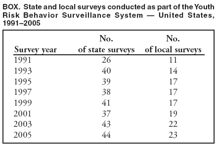 This report summarizes results from the 2005 national Youth Risk Behavior Survey (YRBS) and trends during 1991--2005 in selected risk behaviors. Data from the 40 state and 21 local surveys with weighted data for the 2005 YRBSS cycle also are included (Figure 1). Data from the remaining four state and two local surveys with unweighted data are not included in this report. The national survey, 36 weighted state surveys, and 20 weighted local surveys were conducted during spring 2005. One of the weighted state surveys was conducted during fall 2004, and three of the weighted state surveys and one of the weighted local surveys were conducted during fall 2005.