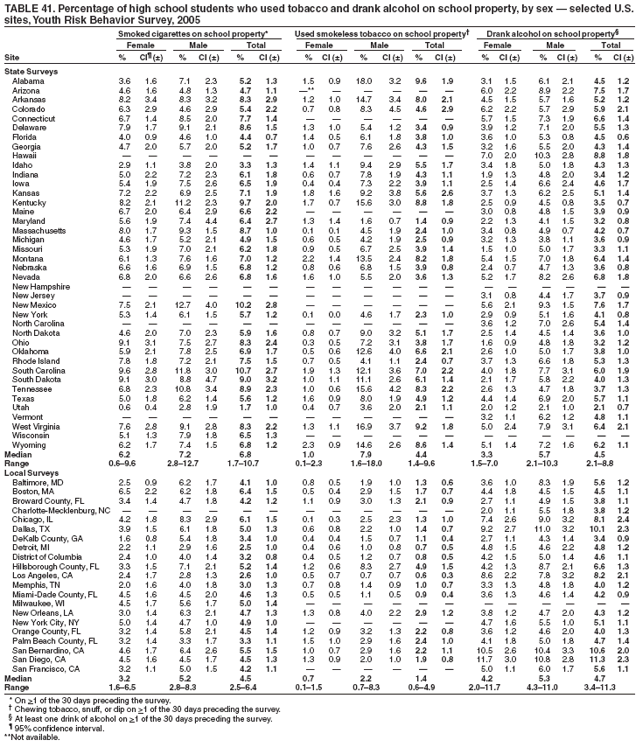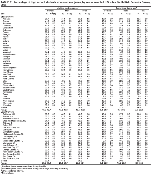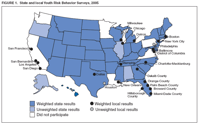 In 2005, each state and local school-based survey employed a two-stage cluster sample design to produce a representative sample of public school students in grades 9--12 in their jurisdiction. In the first sampling stage, schools with any of grades 9--12 were selected with probability proportional to school enrollment size in 38 states and five cities; all schools with any of grades 9--12 were selected in two states and 16 cities. In the second sampling stage, intact classes from either a required subject (e.g., English or social studies) or a required period (e.g., homeroom or second period) were selected randomly, and all students in selected classes were eligible to participate in 39 states and 21 cities; all students in selected schools were selected to participate in one state. State and local surveys that had a scientifically selected sample of students, appropriate documentation, and an overall response rate >60% were weighted. A weight was applied to each record to adjust for student nonresponse and the distribution of students by grade, sex, and race/ethnicity in each jurisdiction. Therefore, weighted estimates are representative of all students in grades 9--12 attending public schools in each jurisdiction.