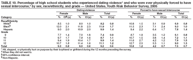During the 12 months preceding the survey, 9.2% of students nationwide had been hit, slapped, or physically hurt on purpose by their boyfriend or girlfriend (i.e., dating violence) (Table 10). Overall, the prevalence of dating violence was higher among black (11.9%) and Hispanic (9.9%) than white (8.2%) students; higher among black female (12.0%) than white female (8.5%) and Hispanic female (9.0%) students; and higher among black male (11.8%) and Hispanic male (10.9%) than white male (8.0%) students. Overall, the prevalence of dating violence was higher among 11th grade (9.9%) and 12th grade (11.1%) than 9th grade (7.4%) students; higher among 12th grade (11.1%) than 10th grade (8.7%) students; higher among 12th grade female (10.7%) than 9th grade female (7.7%) students; and higher among 11th grade male (10.4%) and 12th grade male (11.4%) than 9th grade male (7.0%) and 10th grade male (7.8%) students. Prevalence of dating violence ranged from 6.0% to 16.3% across state surveys (median: 10.6%) and from 7.3% to 20.8% across local surveys (median: 11.4%) (Table 11).