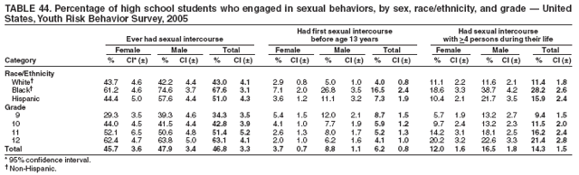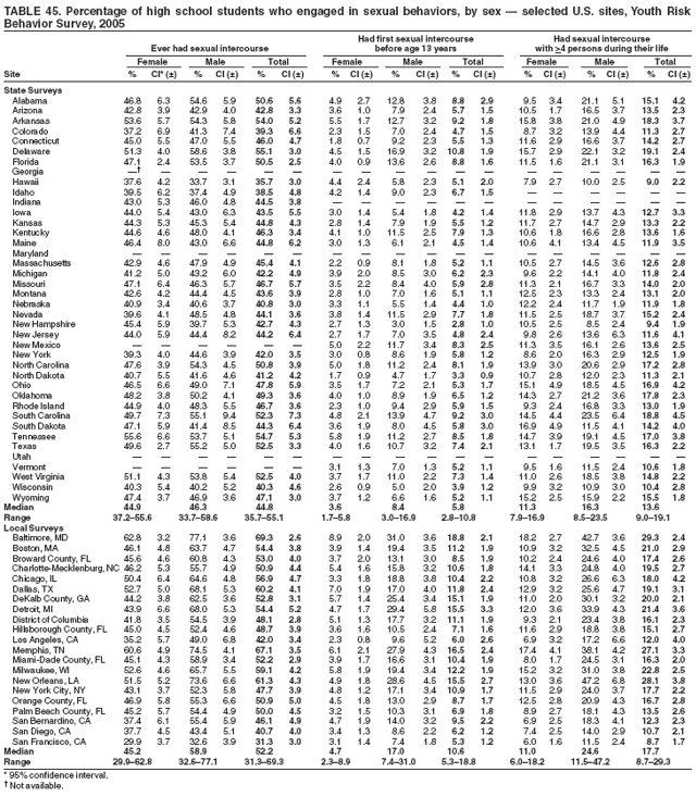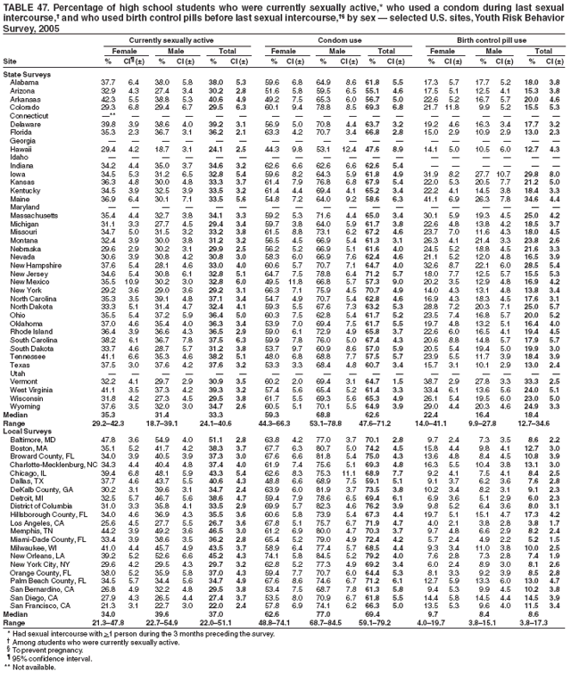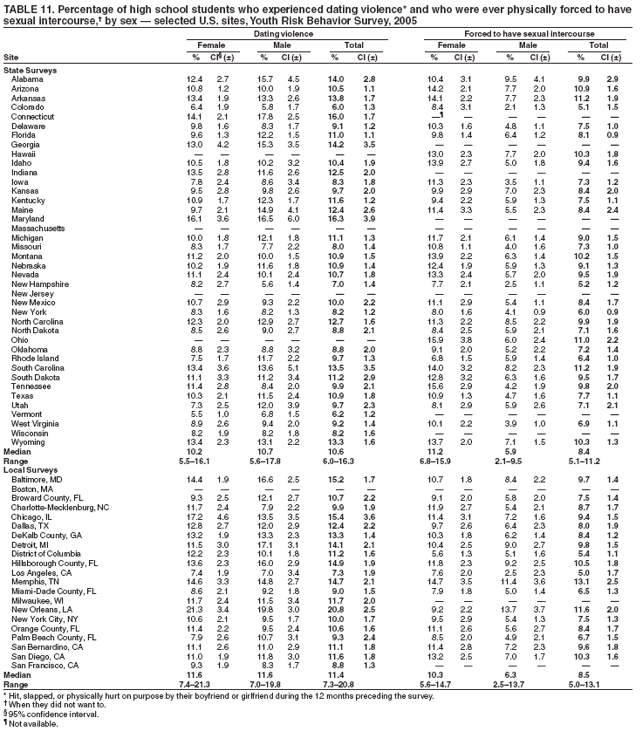 Nationwide, 7.5% of students had ever been physically forced to have sexual intercourse when they did not want to (Table 10). Overall, the prevalence of having been forced to have sexual intercourse was higher among female (10.8%) than male (4.2%) students; higher among white female (10.8%), black female (11.5%), and Hispanic female (9.4%) than white male (3.1%), black male (7.1%), and Hispanic male (6.4%) students, respectively; and higher among 9th grade female (8.7%), 10th grade female (10.7%), 11th grade female (11.6%), and 12th grade female (12.7%) than 9th grade male (3.5%), 10th grade male (3.8%), 11th grade male (4.2%), and 12th grade male (5.3%) students, respectively. Overall, the prevalence of having been forced to have sexual intercourse was higher among black (9.3%) than white (6.9%) students and higher among black male (7.1%) and Hispanic male (6.4%) than white male (3.1%) students. Overall, the prevalence of having been forced to have sexual intercourse was higher among 11th grade (7.9%) and 12th grade (9.0%) than 9th grade (6.1%) students; higher among 12th grade (9.0%) than 10th grade (7.2%) students; higher among 12th grade female (12.7%) than 9th grade female (8.7%) students; and higher among 12th grade male (5.3%) than 9th grade male (3.5%) students. Prevalence of having been forced to have sexual intercourse ranged from 5.1% to 11.2% across state surveys (median: 8.4%) and from 5.0% to 13.1% across local surveys (median: 8.5%) (Table 11).