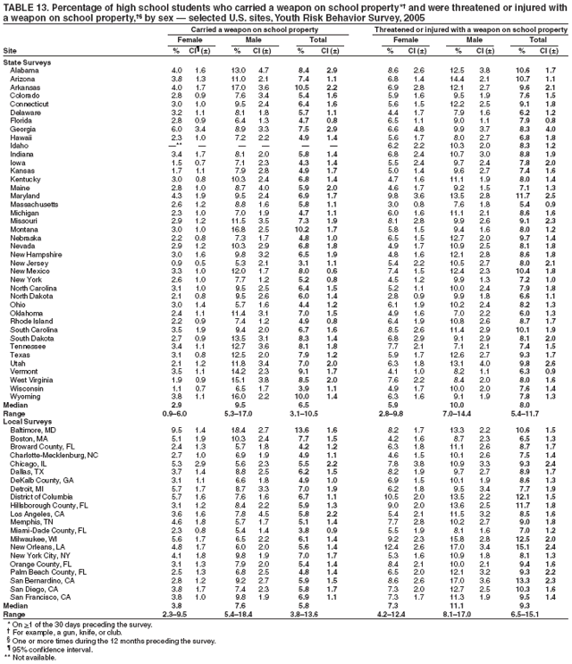 Nationwide, 6.5% of students had carried a weapon (e.g., a gun, knife, or club) on school property on >1 of the 30 days preceding the survey (Table 12). Overall, the prevalence of having carried a weapon on school property was higher among male (10.2%) than female (2.6%) students; higher among white male (10.1%), black male (6.8%), and Hispanic male (13.7%) than white female (2.0%), black female (3.3%), and Hispanic female (2.6%) students, respectively; and higher among 9th grade male (9.8%), 10th grade male (10.5%), 11th grade male (9.8%), and 12th grade male (10.8%) than 9th grade female (2.8%), 10th grade female (3.0%), 11th grade female (2.1%), and 12th grade female (2.5%) students, respectively. Overall, the prevalence of having carried a weapon on school property was higher among Hispanic (8.2%) than black (5.1%) students; higher among black female (3.3%) than white female (2.0%) students; and higher among Hispanic male (13.7%) than black male (6.8%) students. Prevalence of having carried a weapon on school property ranged from 3.1% to 10.5% across state surveys (median: 6.5%) and from 3.8% to 13.6% across local surveys (median: 5.8%) (Table 13).