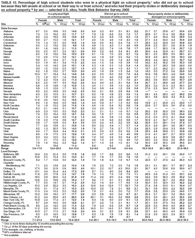 Nationwide, 13.6% of students had been in a physical fight on school property one or more times during the 12 months preceding the survey (Table 14). Overall, the prevalence of having been in a physical fight on school property was higher among male (18.2%) than female (8.8%) students; higher among white male (16.2%), black male (20.1%), and Hispanic male (24.4%) than white female (6.9%), black female (14.0%), and Hispanic female (12.1%) students, respectively; and higher among 9th grade male (24.0%), 10th grade male (20.0%), 11th grade male (14.1%), and 12th grade male (11.8%) than 9th grade female (13.7%), 10th grade female (8.4%), 11th grade female (6.6%), and 12th grade female (5.3%) students, respectively. Overall, the prevalence of having been in a physical fight on school property was higher among black (16.9%) and Hispanic (18.3%) than white (11.6%) students; higher among black female (14.0%) and Hispanic female (12.1%) than white female (6.9%) students; and higher among Hispanic male (24.4%) than white male (16.2%) students. Overall, the prevalence of having been in a physical fight on school property was higher among 9th grade (18.9%) than 10th grade (14.4%), 11th grade (10.4%), and 12th grade (8.5%) students; higher among 10th grade (14.4%) than 11th grade (10.4%) and 12th grade (8.5%) students; higher among 9th grade female (13.7%) than 10th grade female (8.4%), 11th grade female (6.6%), and 12th grade female (5.3%) students; higher among 10th grade female (8.4%) than 12th grade female (5.3%) students; higher among 9th grade male (24.0%) than 10th grade male (20.0%), 11th grade male (14.1%), and 12th grade male (11.8%) students; and higher among 10th grade male (20.0%) than 11th grade male (14.1%) and 12th grade male (11.8%) students. Prevalence of having been in a physical fight on school property ranged from 8.4% to 15.6% across state surveys (median: 11.4%) and from 10.4% to 22.0% across local surveys (median: 14.7%) (Table 15).