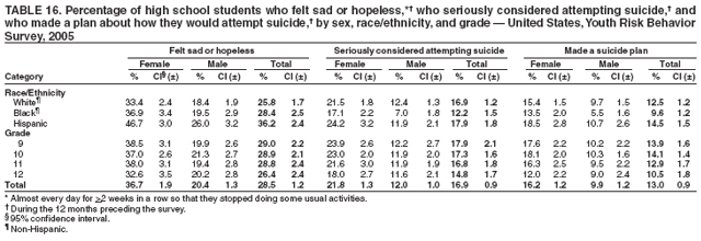 During the 12 months preceding the survey, 28.5% of students nationwide had felt so sad or hopeless almost every day for >2 weeks in a row that they stopped doing some usual activities (Table 16). Overall, the prevalence of having felt sad or hopeless almost every day for >2 weeks was higher among female (36.7%) than male (20.4%) students; higher among white female (33.4%), black female (36.9%), and Hispanic female (46.7%) than white male (18.4%), black male (19.5%), and Hispanic male (26.0%) students, respectively; and higher among 9th grade female (38.5%), 10th grade female (37.0%), 11th grade female (38.0%), and 12th grade female (32.6%) than 9th grade male (19.9%), 10th grade male (21.3%), 11th grade male (19.4%), and 12th grade male (20.2%) students, respectively. Overall, the prevalence of having felt sad or hopeless almost every day for >2 weeks was higher among Hispanic (36.2%) than white (25.8%) and black (28.4%) students; higher among Hispanic female (46.7%) than white female (33.4%) and black female (36.9%) students; and higher among Hispanic male (26.0%) than white male (18.4%) and black male (19.5%) students. The prevalence of having felt sad or hopeless almost every day for >2 weeks was higher among 9th grade female (38.5%), 10th grade female (37.0%), and 11th grade female (38.0%) than 12th grade female (32.6%) students. Prevalence of having felt sad or hopeless almost every day for >2 weeks ranged from 20.3% to 34.3% across state surveys (median: 27.3%) and from 21.8% to 37.6% across local surveys (median: 29.7%) (Table 17).