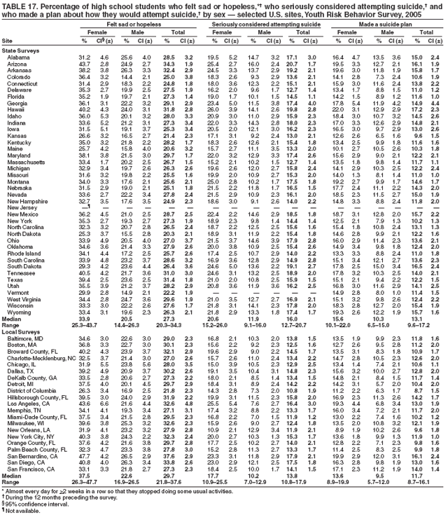 Nationwide, 16.9% of students had seriously considered attempting suicide during the 12 months preceding the survey (Table 16). Overall, the prevalence of having seriously considered attempting suicide was higher among female (21.8%) than male (12.0%) students; higher among white female (21.5%), black female (17.1%), and Hispanic female (24.2%) than white male (12.4%), black male (7.0%), and Hispanic male (11.9%) students, respectively; and higher among 9th grade female (23.9%), 10th grade female (23.0%), 11th grade female (21.6%), and 12th grade female (18.0%) than 9th grade male (12.2%), 10th grade male (11.9%), 11th grade male (11.9%), and 12th grade male (11.6%) students, respectively. Overall, the prevalence of having seriously considered attempting suicide was higher among white (16.9%) and Hispanic (17.9%) than black (12.2%) students; higher among white female (21.5%) and Hispanic female (24.2%) than black female (17.1%) students; and higher among white male (12.4%) and Hispanic male (11.9%) than black male (7.0%) students. Overall, the prevalence of having seriously considered attempting suicide was higher among 9th grade (17.9%) and 10th grade (17.3%) than 12th grade (14.8%) students and higher among 9th grade female (23.9%) and 10th grade female (23.0%) than 12th grade female (18.0%) students. Prevalence of having seriously considered attempting suicide ranged from 12.7% to 20.7% across state surveys (median: 16.0%) and from 10.8% to 17.9% across local surveys (median: 13.8%) (Table 17).