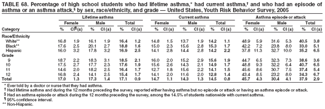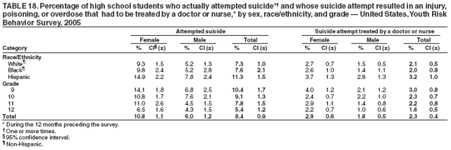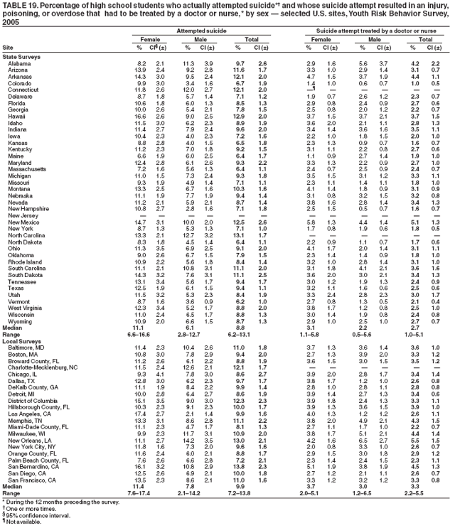 Nationwide, 8.4% of students had actually attempted suicide one or more times during the 12 months preceding the survey (Table 18). Overall, the prevalence of having actually attempted suicide was higher among female (10.8%) than male (6.0%) students; higher among white female (9.3%), black female, (9.8%), and Hispanic female (14.9%) than white male (5.2%), black male (5.2%), and Hispanic male (7.8%) students, respectively; and higher among 9th grade female (14.1%), 10th grade female (10.8%), 11th grade female (11.0%), and 12th grade female (6.5%) than 9th grade male (6.8%), 10th grade male (7.6%), 11th grade male (4.5%), and 12th grade male (4.3%) students, respectively. Overall, the prevalence of having actually attempted suicide was higher among Hispanic (11.3%) than white (7.3%) and black (7.6%) students; higher among Hispanic female (14.9%) than white female (9.3%) and black female (9.8%) students; and higher among Hispanic male (7.8%) than white male (5.2%) students. Overall, the prevalence of having actually attempted suicide was higher among 9th grade (10.4%) than 11th grade (7.8%) and 12th grade (5.4%) students; higher among 10th grade (9.1%), and 11th grade (7.8%) than 12th grade (5.4%) students; higher among 9th grade female (14.1%) than 10th grade female (10.8%) and 12th grade female (6.5%) students; higher among 10th grade female (10.8%) and 11th grade female (11.0%) than 12th grade female (6.5%) students; and higher among 10th grade male (7.6%) than 11th grade male (4.5%) and 12th grade male (4.3%) students. Prevalence of having actually attempted suicide ranged from 6.2% to 13.1% across state surveys (median: 8.8%) and from 7.2% to 13.8% across local surveys (median: 9.9%) (Table 19).