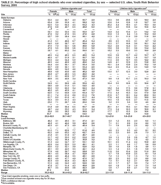 Nationwide, 54.3% of students had ever tried cigarette smoking (even one or two puffs) (i.e., lifetime cigarette use) (Table 20). Overall, the prevalence of lifetime cigarette use was higher among male (55.9%) than female (52.7%) students and higher among Hispanic male (62.1%) than Hispanic female (52.0%) students. The prevalence of lifetime cigarette use was higher among Hispanic male (62.1%) than white male (54.9%) students. Overall, the prevalence of lifetime cigarette use was higher among 10th grade (52.5%), 11th grade (57.5%), and 12th grade (60.3%) than 9th grade (48.7%) students; higher among 11th grade (57.5%) and 12th grade (60.3%) than 10th grade (52.5%) students; higher among 11th grade female (55.3%) and 12th grade female (58.3%) than 9th grade female (47.7%) students; higher among 12th grade female (58.3%) than 10th grade female (50.8%) students; and higher among 11th grade male (59.6%) and 12th grade male (62.2%) than 9th grade male (49.8%) and 10th grade male (54.1%) students. Prevalence of lifetime cigarette use ranged from 25.0% to 63.4% across state surveys (median: 54.5%) and from 35.8% to 62.7% across local surveys (median: 48.6%) (Table 21).