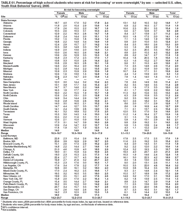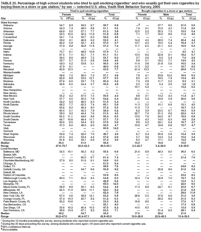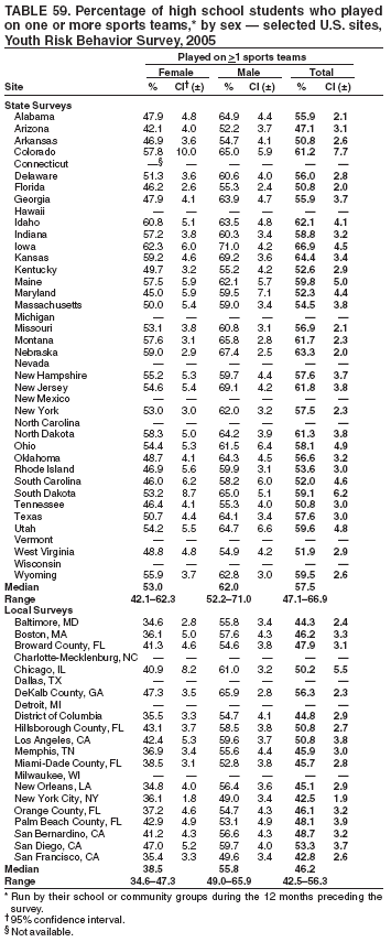 In 2005, a total of 40 state and 21 local surveys had weighted data, and the student sample sizes ranged from 942 to 9,708 (Table 1). School response rates ranged from 72% to 100%; student response rates ranged from 61% to 93%; and overall response rates ranged from 60% to 85%. Additional information about state and local YRBSs is available at http://www.cdc.gov/yrbs.
