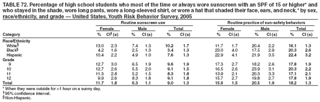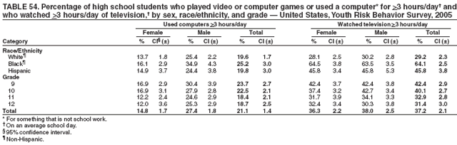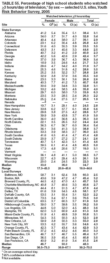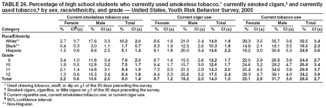 Statistical analyses were conducted on weighted data using SAS® (13) and SUDAAN (14) software to account for the complex sampling designs. Prevalence estimates and confidence intervals were computed for all variables and all data sets. In addition, for the 2005 national YRBS data, t-tests were used to determine pair-wise differences between subpopulations and temporal changes during 2003--2005 (15). Differences between prevalence estimates were considered statistically significant if the t-test p-value was <0.05 for main effects (sex, race/ethnicity, and grade), for interactions (sex by race/ethnicity and sex by grade), and for changes over time. Only statistically significant differences in prevalence estimates are reported in the results section in the following order: sex, sex by race/ethnicity, sex by grade, race/ethnicity, race/ethnicity by sex, grade, and grade by sex.