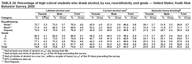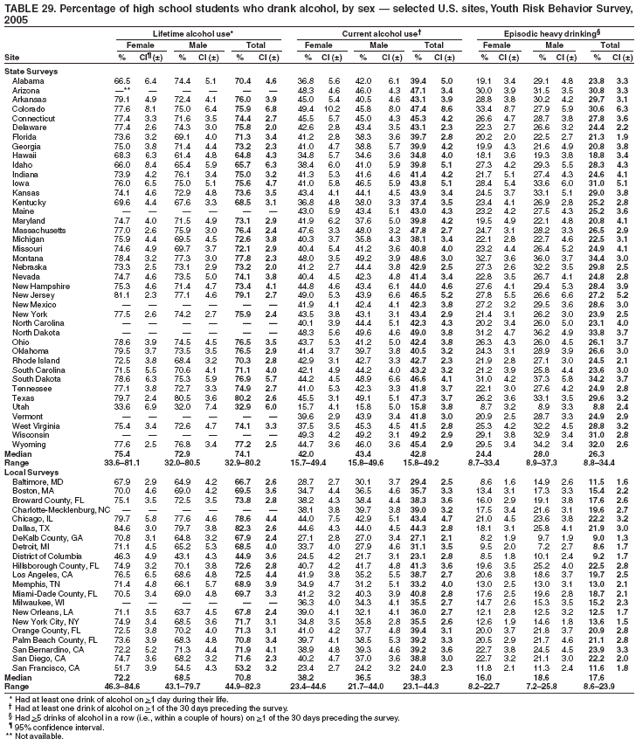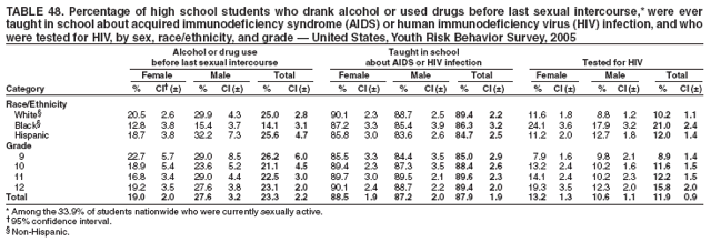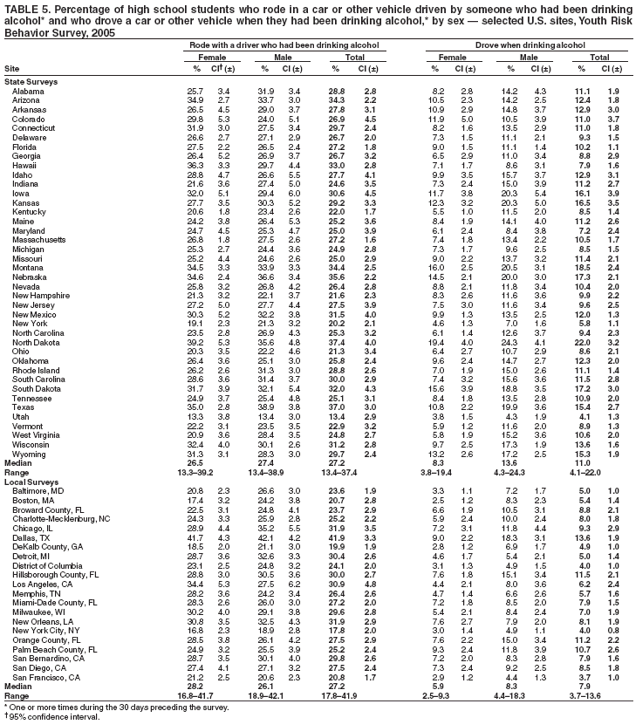 During the 30 days preceding the survey, 28.5% of students nationwide had ridden one or more times in a car or other vehicle driven by someone who had been drinking alcohol (Table 4). Overall, the prevalence of having ridden with a driver who had been drinking alcohol was higher among female (29.6%) than male (27.2%) students; higher among white female (30.4%) than white male (26.2%) students; and higher among 10th grade female (29.5%) than 10th grade male (26.2%) students. Overall, the prevalence of having ridden with a driver who had been drinking alcohol was higher among white (28.3%) and Hispanic (36.1%) than black (24.1%) students; higher among Hispanic (36.1%) than white (28.3%) students; higher among white female (30.4%) and Hispanic female (34.7%) than black female (24.0%) students; higher among Hispanic female (34.7%) than white female (30.4%) students; and higher among Hispanic male (37.4%) than white male (26.2%) and black male (24.3%) students. Overall, the prevalence of having ridden with a driver who had been drinking alcohol was higher among 12th grade (30.1%) than 10th grade (27.8%) students. Prevalence of having ridden with a driver who had been drinking alcohol ranged from 13.4% to 37.4% across state surveys (median: 27.2%) and from 17.8% to 41.9% across local surveys (median: 27.2%) (Table 5).