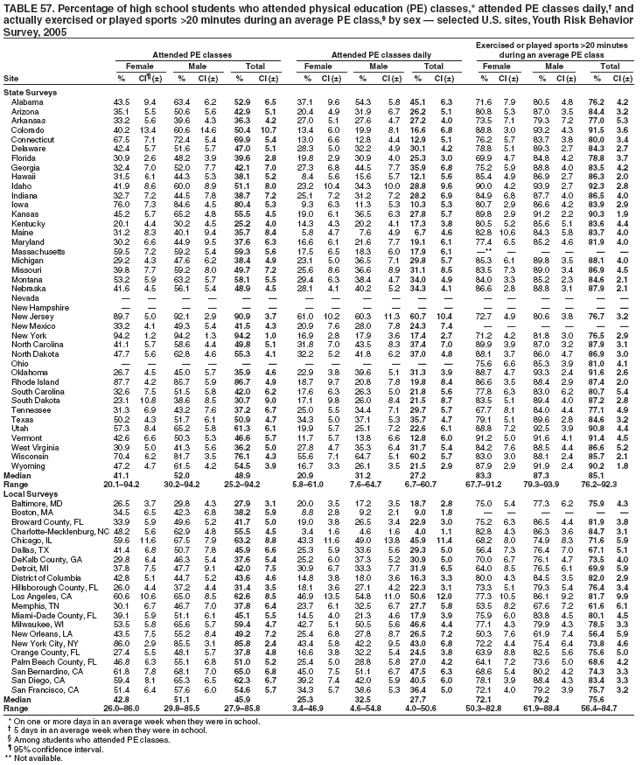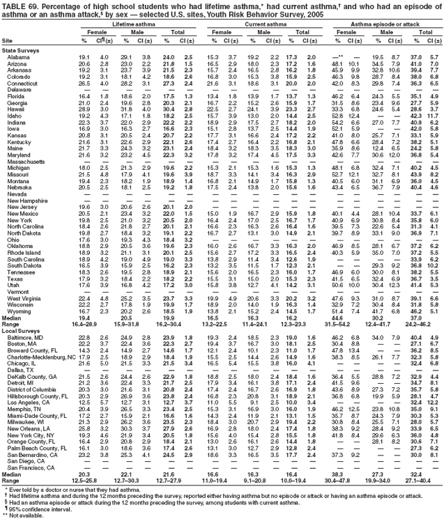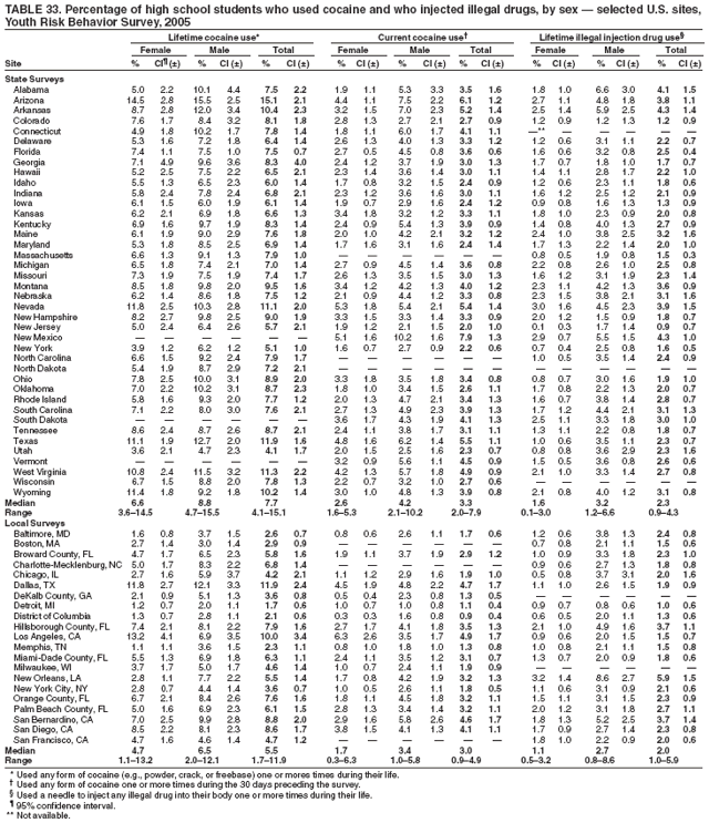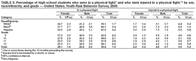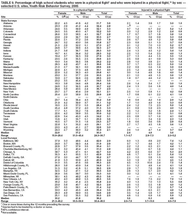 Nationwide, 3.6% of students had been in a physical fight one or more times during the 12 months preceding the survey in which they were injured and had to be treated by a doctor or nurse (Table 8). Overall, the prevalence of having been injured in a physical fight was higher among male (4.8%) than female (2.4%) students; higher among white male (3.1%), black male (7.4%), and Hispanic male (7.5%) than white female (1.7%), black female (3.5%), and Hispanic female (3.2%) students, respectively; and higher among 9th grade male (5.8%), 10th grade male (4.3%), 11th grade male (4.0%), and 12th grade male (4.2%) than 9th grade female (3.4%), 10th grade female (1.9%), 11th grade female (1.9%), and 12th grade female (2.3%) students, respectively. Overall, the prevalence of having been injured in a physical fight was higher among black (5.4%) and Hispanic (5.3%) than white (2.4%) students; higher among black female (3.5%) and Hispanic female (3.2%) than white female (1.7%) students; and higher among black male (7.4%) and Hispanic male (7.5%) than white male (3.1%) students. Overall, the prevalence of having been injured in a physical fight was higher among 9th grade (4.6%) than 10th grade (3.1%), 11th grade (3.0%), and 12th grade (3.2%) students and higher among 9th grade female (3.4%) than 10th grade female (1.9%) and 11th grade female (1.9%) students. Prevalence of having been injured in a physical fight ranged from 2.3% to 5.2% across state surveys (median: 3.6%) and from 4.0% to 7.9% across local surveys (median: 4.8%) (Table 9).