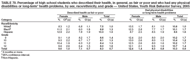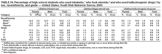 During the 12 months preceding the survey, 2.3% of students nationwide had made a suicide attempt that resulted in an injury, poisoning, or overdose that had to be treated by a doctor or nurse (Table 18). Overall, the prevalence of having made a suicide attempt that required medical attention was higher among female (2.9%) than male (1.8%) students; higher among white female (2.7%) than white male (1.5%) students; and higher among 9th grade female (4.0%), 11th grade female (2.9%), and 12th grade female (2.2%) than 9th grade male (2.1%), 11th grade male (1.4%), and 12th grade male (1.0%) students, respectively. Overall, the prevalence of having made a suicide attempt that required medical attention was higher among Hispanic (3.2%) than white (2.1%) students. Overall, the prevalence of having made a suicide attempt that required medical attention was higher among 9th grade (3.0%) than 12th grade (1.6%) students; higher among 9th grade female (4.0%) than 10th grade female (2.4%) and 12th grade female (2.2%) students; and higher among 10th grade male (2.2%) than 12th grade male (1.0%) students. Prevalence of having made a suicide attempt that required medical attention ranged from 1.0% to 5.1% across state surveys (median: 2.7%) and from 2.2% to 5.5% across local surveys (median: 3.3%) (Table 19).