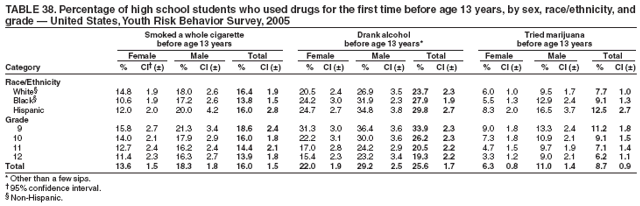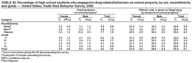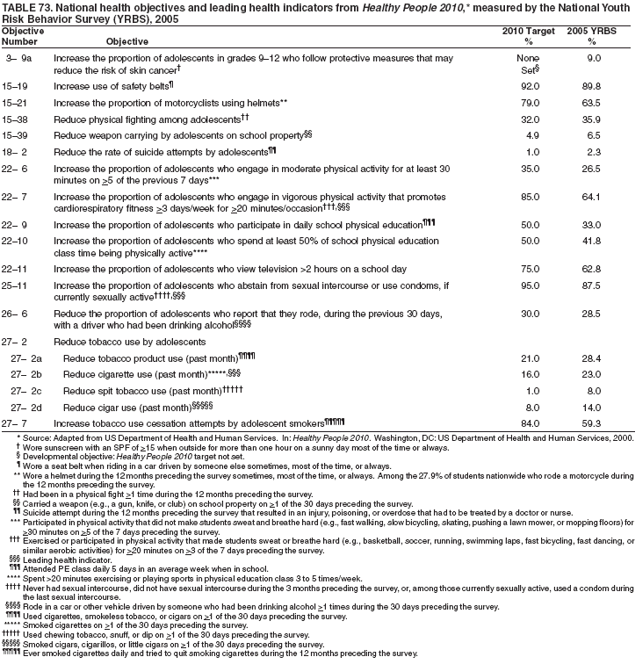 Results: In the United States, 71% of all deaths among persons aged 10--24 years result from four causes: motor-vehicle crashes, other unintentional injuries, homicide, and suicide. Results from the 2005 national Youth Risk Behavior Survey (YRBS) indicated that, during the 30 days preceding the survey, many high school students engaged in behaviors that increased their likelihood of death from these four causes: 9.9% had driven a car or other vehicle when they had been drinking alcohol; 18.5% had carried a weapon; 43.3% had drunk alcohol; and 20.2% had used marijuana. In addition, during the 12 months preceding the survey, 35.9% of high school students had been in a physical fight and 8.4% had attempted suicide. Substantial morbidity and social problems among youth also result from unintended pregnancies and STDs, including HIV infection. During 2005, a total of 46.8% of high school students had ever had sexual intercourse; 37.2% of sexually active high school students had not used a condom at last sexual intercourse; and 2.1% had ever injected an illegal drug. Among adults aged >25 years, 61% of all deaths result from two causes: cardiovascular disease and cancer. Results from the 2005 national YRBS indicated that risk behaviors associated with these two causes of death were initiated during adolescence. During 2005, a total of 23.0% of high school students had smoked cigarettes during the 30 days preceding the survey; 79.9% had not eaten >5 times/day of fruits and vegetables during the 7 days preceding the survey; 67.0% did not attend physical education classes daily; and 13.1% were overweight.
