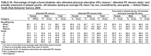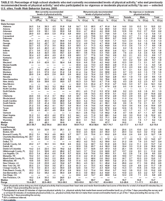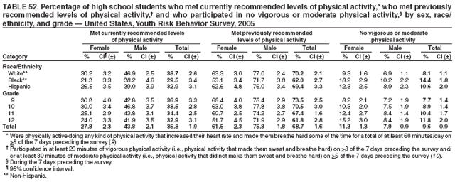 To reflect the physical activity recommendations for youth in the 2005 Dietary Guidelines for Americans (engage in at least 60 minutes of physical activity on most, preferably all, days of the week [9]), a new question was added to the core questionnaire in 2005: "During the past 7 days, on how many days were you physically active for a total of at least 60 minutes per day? (Add up all the time you spend in any kind of physical activity that increases your heart rate and makes you breathe hard some of the time)." Data on the percentage of students who met recommended levels of physical activity (i.e., participated in at least 60 minutes/day of physical activity for >5 of the 7 days preceding the survey) are included in this report. The vigorous and moderate physical activity variables reported in previous YRBS reports are not individually included in this report, but are used to calculate the percentage of students who met previously recommended levels of physical activity, defined as participation in at least 20 minutes of vigorous physical activity (i.e., physical activity that made them sweat and breathe hard) on >3 of the 7 days preceding the survey and/or at least 30 minutes of moderate physical activity (i.e., physical activity that did not make them sweat and breathe hard) on >5 of the 7 days preceding the survey (10) and the percentage of students who engaged in no physical activity (i.e., had not engaged in any vigorous or moderate physical activity during the 7 days preceding the survey). The vigorous and moderate physical activity variables also remain measures for Healthy People 2010 objectives 22-6 and 22-7 (10).