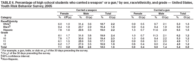 Nationwide, 18.5% of students had carried a weapon (e.g., a gun, knife, or club) on >1 of the 30 days preceding the survey (Table 6). Overall, the prevalence of having carried a weapon was higher among male (29.8%) than female (7.1%) students; higher among white male (31.4%), black male (23.7%), and Hispanic male (29.8%) than white female (6.0%), black female (9.4%), and Hispanic female (7.8%) students, respectively; and higher among 9th grade male (31.6%), 10th grade male (30.6%), 11th grade male (28.6%), and 12th grade male (27.6%) than 9th grade female (8.1%), 10th grade female (7.8%), 11th grade female (6.1%), and 12th grade female (6.2%) students, respectively. The prevalence of having carried a weapon was higher among black female (9.4%) than white female (6.0%) students and higher among white male (31.4%) and Hispanic male (29.8%) than black male (23.7%) students. Overall, the prevalence of having carried a weapon was higher among 9th grade (19.9%) and 10th grade (19.4%) than 12th grade (16.9%) students. Prevalence of having carried a weapon ranged from 10.5% to 28.0% across state surveys (median: 18.4%) and from 11.9% to 25.0% across local surveys (median: 16.9%) (Table 7).