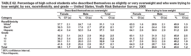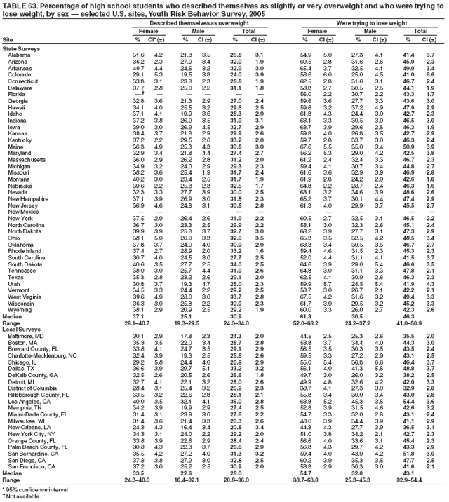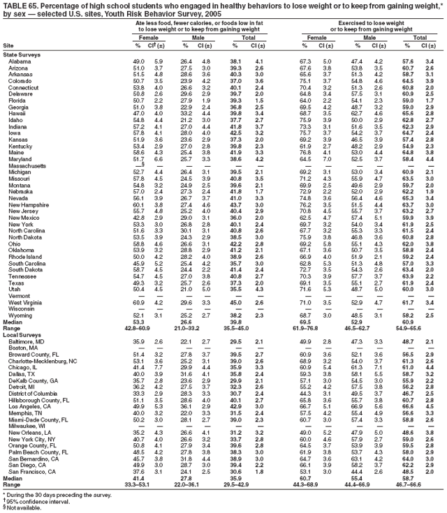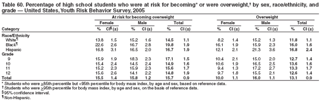 To determine the percentage of high school students at risk for becoming overweight, body mass index (kg/m2) (BMI) was calculated from self-reported height and weight. The BMI values were compared to sex and age specific reference data from the 2000 CDC Growth Charts (11). At risk for becoming overweight was defined as a BMI of >85th percentile and <95th percentile for age and sex. Overweight was defined as a BMI of >95th percentile for age and sex. A BMI of >95th percentile for age and sex among adolescents is approximately equivalent to a BMI of >30 among adults. For an adult, a BMI of 30 is approximately 30 pounds overweight. The reliability and validity of self-reported height and weight among high school students is described elsewhere (12).