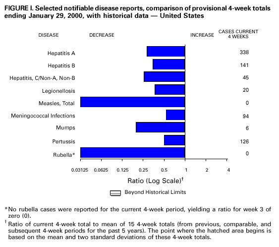 Persons using assistive technology might not be able to fully access information in this file. For assistance, please send e-mail to: mmwrq@cdc.gov. Type 508 Accommodation and the title of the report in the subject line of e-mail. Notifiable Diseases/Deaths in Selected Cities Weekly InformationFigure I Selected notifiable disease reports, comparison of provisional 4-week totals ending January 29, 2000, with historical data -- United States Table I Summary -- provisional cases of selected notifiable diseases, United States, cumulative, week ending January 29, 2000 (4th Week) Table II Provisional cases of selected notifiable diseases, United States, weeks ending January 29, 2000 and January 30, 1999 (4th Week) Table III Provisional cases of selected notifiable diseases preventable by vaccination, United States, weeks ending January 29, 2000 and January 30, 1999 (4th Week) Table IV Deaths in 122 U.S. cities, week ending January 29, 2000 (4th Week) Figure I ![]() Return to top. Table I Note: To print large tables and graphs users may have to change their printer settings to landscape and use a small font size. TABLE I. Summary -- provisional cases of selected notifiable diseases, United