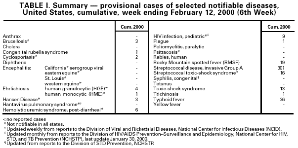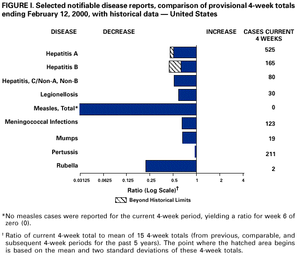 Persons using assistive technology might not be able to fully access information in this file. For assistance, please send e-mail to: mmwrq@cdc.gov. Type 508 Accommodation and the title of the report in the subject line of e-mail. Notifiable Diseases/Deaths in Selected Cities Weekly InformationPlease note: An erratum has been published for this article. To view the erratum, please click here. Figure I Selected notifiable disease reports, comparison of provisional 4-week totals ending February 12, 2000, with historical data -- United States Table I Summary -- provisional cases of selected notifiable diseases, United States, cumulative, week ending February 12, 2000 (6th Week) Table II Provisional cases of selected notifiable diseases, United States, weeks ending February 12, 2000 and February 13, 1999 (6th Week) Table III Provisional cases of selected notifiable diseases preventable by vaccination, United States, weeks ending February 12, 2000 and February 13, 1999 (6th Week) Table IV Deaths in 122 U.S. cities, week ending February 12, 2000 (6th Week) Erratum: Vol. 49, No. 6 On page 126, in Table II (Cont’d), Provisional cases of selected notifiable diseases, United States, weeks ending February 12, 2000, and February 13, 1999 (6th Week), the data for malaria, animal rabies, and salmonellosis were incorrect. The table with the corrected data appear on the following page.