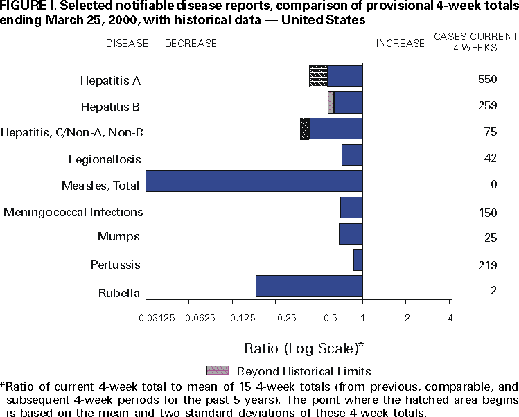 Persons using assistive technology might not be able to fully access information in this file. For assistance, please send e-mail to: mmwrq@cdc.gov. Type 508 Accommodation and the title of the report in the subject line of e-mail. Notifiable Diseases/Deaths in Selected Cities Weekly InformationFigure I Selected notifiable disease reports, comparison of provisional 4-week totals ending March 25, 2000, with historical data -- United States Table I Summary -- provisional cases of selected notifiable diseases, United States, cumulative, week ending March 25, 2000 (12th Week) Table II Provisional cases of selected notifiable diseases, United States, weeks ending March 25, 2000 and March 27, 1999 (12th Week) Table III Provisional cases of selected notifiable diseases preventable by vaccination, United States, weeks ending March 25, 2000 and March 27, 1999 (12th Week) Table IV Deaths in 122 U.S. cities, week ending March 25, 2000 (12th Week) Figure I ![]() Return to top. Table I ![]() Return to top. Table II