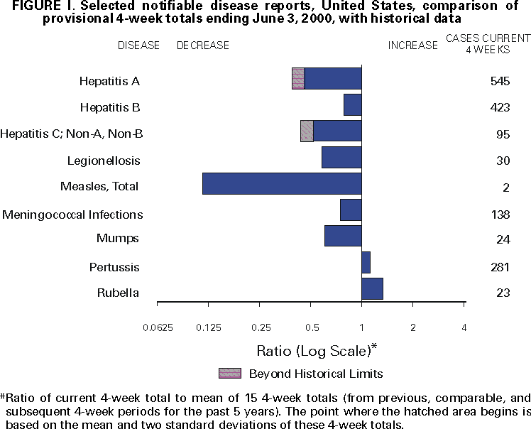 Persons using assistive technology might not be able to fully access information in this file. For assistance, please send e-mail to: mmwrq@cdc.gov. Type 508 Accommodation and the title of the report in the subject line of e-mail. Notifiable Diseases/Deaths in Selected Cities Weekly InformationFigure I Selected notifiable disease reports, comparison of provisional 4-week totals ending June 3, 2000, with historical data -- United States Table I Summary -- provisional cases of selected notifiable diseases, United States, cumulative, week ending June 3, 2000 (22nd Week) Table II Provisional cases of selected notifiable diseases, United States, weeks ending June 3, 2000 and June 5, 1999 (22nd Week) Table III Provisional cases of selected notifiable diseases preventable by vaccination, United States, weeks ending June 3, 2000 and June 5, 1999 (22nd Week) Table IV Deaths in 122 U.S. cities, week ending June 3, 2000 (22nd Week) Figure I ![]() Return to top. Table I ![]() Return to top. Table II