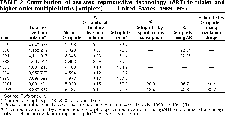 Persons using assistive technology might not be able to fully access information in this file. For assistance, please send e-mail to: mmwrq@cdc.gov. Type 508 Accommodation and the title of the report in the subject line of e-mail. Contribution of Assisted Reproductive Technology and Ovulation-Inducing Drugs to Triplet and Higher-Order Multiple Births --- United States, 1980--1997In the United States, pregnancies associated with assisted reproductive technology (ART) or ovulation-inducing drugs are more likely to result in multiple births than spontaneously conceived pregnancies (1). In addition, triplet and higher-order multiple births are at greater risk than singleton births to be preterm (<37 completed weeks' gestation), low birthweight (LBW) (i.e., <2500 g), or very low birthweight (i.e., <1500 g), resulting in higher infant morbidity and mortality (2). Because preterm and LBW infants often require costly neonatal care and long-term developmental follow-up, the continuing increase in triplet and higher-order multiple births causes concern among health-care providers and policymakers (3). This report provides estimates of the contribution of ART and ovulation-inducing drugs to these birth outcomes for 1996 and 1997, and summarizes trends during 1980--1997, which indicate that the ratio of triplet and higher-order multiple births has more than quadrupled and that a large proportion of this increase can be attributed to ART or the use of ovulation-inducing drugs. CDC's National Center for Health Statistics (NCHS) provided data on live-born infants of triplet and higher-order multiple deliveries (4), and the Society for Assisted Reproductive Technology (SART) reporting system for ART clinics provided the clinical outcomes of ART-associated pregnancies. The 1992 Fertility Clinic Success Rate and Certification Act requires that every U.S. medical center that performs ART report to CDC data for every ART cycle* initiated annually to calculate clinic-specific pregnancy success rates (5). This report uses data from 1996, the first full year CDC collected ART data, and 1997, the latest year of completed data collection. In NCHS and SART, multiple births are counted as individual births rather than sets of triplet and higher-order multiple births. Triplets constituted most triplet and higher-order multiple births: 5298 (89.2%) of 5939 in 1996 and 6148 (91.2%) of 6737 in 1997 (4). ART-related triplet and higher-order multiple births for 1996 and 1997 were expressed as a ratio (i.e., the proportion of ART-related triplet and higher-order multiple births to all live-born infants). The impact of ovulation-inducing drugs not associated with an ART procedure was estimated by subtracting both ART-related births (from the SART reporting system) and spontaneously occurring triplet and higher-order multiple births (6) from the total number of these births. To account for the upward shift in maternal age distribution since 1971 and the increase in spontaneously occurring triplets and higher-order multiple births in women of reproductive age, the ratios for spontaneously occurring outcomes were adjusted for the maternal age distribution of 1997 using the relevant ratios for 1971 (2). This adjustment resulted in a 10% increase in spontaneously occurring triplet and higher-order multiple births from 29 per 100,000 live-born infants in 1971 to 32 per 100,000 live-born infants in 1997. The ratio of triplet and higher-order multiple births for all age groups increased from 29 in 1971 to 37 in 1980; this trend began after the Food and Drug Administration approved two ovulation-inducing drugs, one in 1967 and another in 1970. Following the introduction of ART approximately in 1980, the ratio more than quadrupled to 174 in 1997 (Table 1). Among mothers aged <20 years, the ratio increased from 15 to 21; among mothers aged 35--39 years, the ratio increased from 48 to 403. The contribution of ART to the overall triplet and higher-order multiple birth ratio was estimated to be 38.7% in 1996 and 43.3% in 1997, a substantial increase from the estimated 22% for 1990 and 1991 (Table 2). For both years, approximately 20% were attributable to spontaneously occurring triplets and higher-order multiple births and approximately 40% were attributable to ovulation-inducing drugs without ART. Reported by: Div of Reproductive Health, National Center for Chronic Disease Prevention and Health Promotion; Div of Applied Public Health Training, Epidemiology Program Office; Div of Vital Statistics, National Center for Health Statistics; and an EIS Officer, CDC. Editorial Note:Despite small variations in fertility rates throughout the 1930s--1960s, the ratio for triplet and higher-order multiple births remained stable at approximately 30 per 100,000 live-born infants (6). The reported increase in the ratio of triplet and higher-order multiple births in subsequent decades illustrates the impact of ART and other infertility treatments. The findings in this study are subject to at least three limitations. First, reliable information could not be obtained on the availability and use of ovulation-inducing drugs in the United States. Such information might have been useful in determining the contribution of these drugs to the reported increased ratios and to the increase in triplet and higher-order multiple births affecting all age groups. Second, because ART data were available for only 2 full years (1996 and 1997), trend analysis was not possible. Third, bias might have been introduced using 1971 triplet and higher-order multiple birth ratios for direct age adjustment, which were based on a 50% sample of birth certificate data compared with 100% of data for 1985--1997. Because of the risk factors associated with multifetal births, continued surveillance of pregnancies associated with infertility treatments is important. Although the impact of ART on overall triplet and higher-order multiple births can be estimated using SART data, no reporti