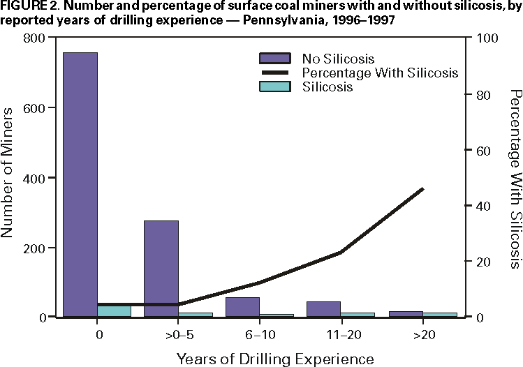 Persons using assistive technology might not be able to fully access information in this file. For assistance, please send e-mail to: mmwrq@cdc.gov. Type 508 Accommodation and the title of the report in the subject line of e-mail. Silicosis Screening in Surface Coal Miners --- Pennsylvania, 1996--1997Silicosis is an occupational respiratory disease caused by inhaling respirable crystalline silica dust. Silicosis is irreversible, often progressive (even after exposure has ceased), and potentially fatal. Exposure to silica dust occurs in many occupations, including mining (1). During 1996--1997, surface coal miners at eight sites in Pennsylvania were screened to estimate the prevalence of silicosis, to identify risk factors for silicosis, and to refer miners with a possible diagnosis of silicosis or other conditions for medical evaluation and treatment. This report summarizes the results of the screening, which indicated that an increased prevalence of and risk for silicosis is associated with miners' age and years of drilling experience, and provides recommendations for preventing silicosis among miners. Enrollment in the screening was voluntary and available to anyone who had worked in surface mining for 1 year or more. Surface miners were informed of the screening by Mine Safety and Health Administration (MSHA) inspectors during routine mine visits. Screening was performed by a multiagency team from the Chronic Respiratory Disease Program of the Pennsylvania Department of Health (team leader), the Department of Health Evaluation Sciences of the Pennsylvania State University College of Medicine, MSHA, and CDC's National Institute for Occupational Safety and Health (NIOSH). Screening was conducted during May--June 1996, at five mine sites in bituminous coalfields in western Pennsylvania (Altoona, Clearfield, Farmington, Indiana, and Somerset) and, in June 1997, at three mine sites in anthracite coalfields in eastern Pennsylvania (Centralia, Pottsville, and Wilkes-Barre). The screening was divided by coal type and region because of differences in geology and mining practices. Screening consisted of anterior-posterior chest radiographs; spirometry; and a survey containing questions about demographics; medical, work, and smoking history; and workplace exposures. Silicosis was defined as a radiographic finding of International Labour Organization (ILO) classification of profusion category >1/0 (2); classification was based on consensus of at least two of three NIOSH-certified B readers*. Descriptive analyses were performed on all variables collected from the radiographs, spirometry, and surveys. Multivariable logistic regression models were used to determine risk factors for developing silicosis. During 1996--1997, 1250 current and former coal miners were screened at the eight sites (664 in western and 586 in eastern Pennsylvania); and data from 1236 miners were suitable for analysis (Figure 1). Screened miners were almost exclusively white (99.9%), male (99.5%), and non-Hispanic (97.6%); the mean age was 46.2 years (range: 18--87 years). Of 1221 miners, 289 (23.7%) were current smokers, and 729 (59.7%) had ever smoked; 1120 (90.7%) of 1235 were employed full-time. Radiographic evidence of silicosis was found in 83 (6.7%) of 1236 screened miners. Prevalence of silicosis did not vary by smoking status, and no significant differences in prevalence were noted by site except among the 213 participants at Clearfield (16.0%; p=0.001). When data from Clearfield were excluded, the prevalence of silicosis was similar for western (5.2%) and eastern (4.5%) Pennsylvania. The odds ratio (OR) for silicosis at the Clearfield site compared with other western sites was 4.4 (95% confidence interval [CI]=2.3--8.5); the OR for silicosis at eastern sites was 1.1 (95% CI=0.6--2.1) compared with western sites, excluding Clearfield. The mean age of miners with silicosis was 50.6 years and without silicosis was 45.6 years (p=0.0002). When age was modeled as a quadratic function in the logistic regression model, a significant increase in silicosis occurred with increasing age. Compared with miners aged 30 years, miners aged 40, 50, and 60 years had progressively increased odds of silicosis: 3.7 (95% CI=1.7--8.2), 7.8 (95% CI=2.4--25.3), and 9.7 (95% CI=3.0--31.6), respectively. Silicosis prevalence increased as the number of reported years of drilling experience increased, from 37 (4.7%) of 792 miners reporting no drilling experience to 12 (46%) of 26 in miners reporting >20 years experience (Figure 2). Compared with miners with <5 years of drilling experience, those who had 6--10, 11--20, and >20 years experience had progressively increased odds of silicosis: 4.3 (95% CI=1.6--11.8), 7.0 (95% CI=2.6--18.6), and 14.5 (95% CI=4.8--43.6), respectively. Reported by: PA Tyson, MSW, Chronic Respiratory Disease Program, Pennsylvania Dept of Health. JL Stauffer, MD, EA Mauger, PhD, JE Caulfield, MS, Pennsylvania State Univ College of Medicine, Hershey. DW Conrad, KG Stricklin, Mine Safety and Health Administration, US Dept of Labor. Div of Respiratory Disease Studies; Office for Mine Safety and Health, Pittsburgh Research Laboratory, National Institute for Occupational Safety and Health, CDC. Editorial Note:This report underscores the risk for silicosis associated with surface coal mining operations. Previous studies identified an increased risk for silicosis among rock drillers (3), and this report corroborates the increased prevalence of silicosis among surface coal mining drillers (4,5). The findings in this report are subject to at least four limitations. First, the sample was voluntary and represented approximately 40% of Pennsylvania surface coal miners (63% of anthracite miners and 29% of bituminous miners§); therefore, the results do not necessarily represent all surface coal miners in Pennsylvania or the United States. Silicosis prevalence may be underestimated if miners with confirmed or suspected silicosis did not