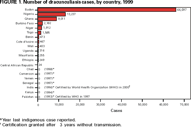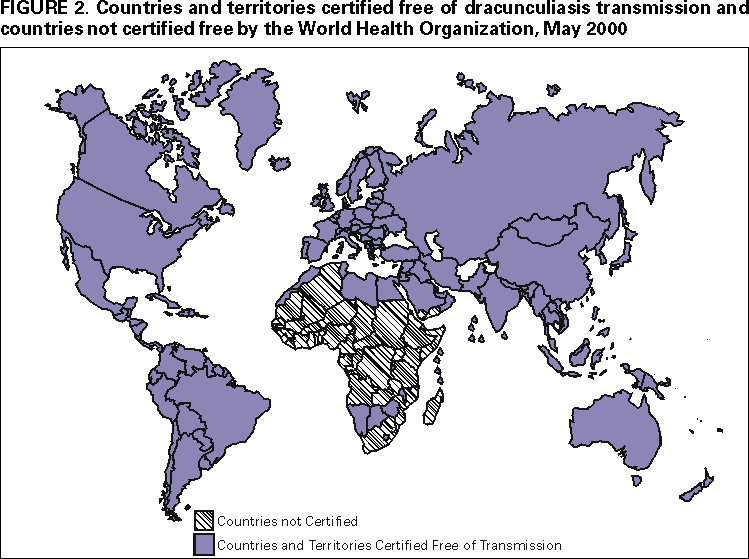 Persons using assistive technology might not be able to fully access information in this file. For assistance, please send e-mail to: mmwrq@cdc.gov. Type 508 Accommodation and the title of the report in the subject line of e-mail. Progress Toward Global Dracunculiasis Eradication, June 2000In 1986, an estimated 3 million persons were infected with dracunculiasis (Guinea worm disease) and another 120 million were at risk for infection (1). That year and in 1991, the World Health Assembly called for the eradication of dracunculiasis (2,3), and as a result of the implementation of the Dracunculiasis Eradication Program (DEP)*, the annual incidence was reduced by approximately 95% by 1995 (4). This report updates the status of the eradication program as of June 2000, which indicates that dracunculiasis has been eliminated from seven of 20 countries where it was endemic in 1995; however, in parts of Africa, particularly Sudan, dracunculiasis remains a serious public health problem. For surveillance purposes, village-based health workers search for infected persons in each village with endemic disease and complete a register that provides the basis for monthly zonal, district, and national surveillance reports (5). During 1999, dracunculiasis was endemic in 13 countries in Africa. These countries reported 96,293 cases in 10,914 villages. Of the total number of cases, Sudan reported 66,097 (69%) cases in 7271 villages; 2606 of the known villages with endemic disease in Sudan were not accessible to program surveillance. Outside Sudan, 93% of 3068 villages reported monthly; in Sudan, 44% of 4892 accessible villages reported monthly. Outside Sudan, 20% of all villages with endemic disease reported 1 case each. Seven of the 13 countries with endemic disease reported <500 cases each in 1999 (Figure 1). During January--June 2000, the number of cases reported by all countries except Sudan was 12,097, 18% less than the 14,828 cases reported during the same period in 1999. The rate of reduction in all countries outside of Sudan was 35% except in Ghana, which reported a slight increase in cases during the first half of 2000. Niger reported 59% fewer cases during January--June 2000. Benin, Cote d'Ivoire, Ethiopia, Mali, Mauritania, and Uganda have reduced the number of cases by an average of 55% during January-- June 2000. Nigeria reported 35% fewer cases during January--June 2000 than during the same period in 1999. All programs attempt to control the spread of disease using case containment (i.e., patients were not allowed to contaminate water and transmit infection) aimed at detecting cases within 24 hours of emergence of the worm and instituting prevention measures immediately. Approximately 62% of the case-patients reported outside of Sudan during 1999 were contained; 68% were contained during January--June 2000. The long-standing civil war in Sudan is the primary reason for the high rate of dracunculiasis in the southern part of that country; however, the 10 northern states of Sudan have reported 66% fewer cases during the first 6 months of 2000 compared with the same period last year (21 versus 61 cases); 16 (76%) of the 21 cases were contained. Reported by: Global 2000, The Carter Center, Atlanta, Georgia. World Health Organization Collaborating Center for Research, Training, and Eradication of Dracunculiasis. Div of Parasitic Diseases, National Center for Infectious Diseases, CDC. Editorial Note:Dracunculiasis is a parasitic infection acquired by drinking water from ponds contaminated by copepods (water fleas) that contain immature forms of the parasite. A year after entering the infected person, the 40-inch (1 meter) worm(s) emerge, usually on the lower limbs through skin wounds that frequently become contaminated secondarily. Reinfection can occur if the person again drinks contaminated water. No effective treatment exists; however, two countries in which dracunculiasis was endemic at the beginning of the program (Pakistan and India) have been certified by the World Health Organization (WHO) to have interrupted transmission. WHO also has certified the absence of transmission from almost all countries outside Africa (Figure 2) (6). All countries with endemic disease are required to submit a report to the International Commission for the Certification of Dracunculiasis Eradication, documenting the absence of indigenous cases of the disease for at least 3 consecutive years to be recommended for certification. Most eradication programs have begun listing villages with endemic disease in descending order of number of cases reported to help monitor the status of interventions. Nylon filters have been distributed to all households in 47% of villages with known endemic disease, including 67% outside Sudan. The larvicide Abate®§ (temephos) (American Home Products, Princeton, New Jersey) is being used in approximately 35% of villages with endemic disease outside Sudan, and 43% of villages with endemic disease outside Sudan have access to at least one source of safe drinking water (Table 1). Health education and community mobilization activities (e.g., radio announcements; posters; town criers; and talks by religious, political, and traditional leaders) aimed at persons in villages endemic with disease or at high risk for disease have been intensified. The current goal of DEP is to eliminate transmission in all remaining countries with endemic disease outside Sudan by 2001. An estimated 3 to 4 years of intense activities will be required to halt dracunculiasis transmission after a peace agreement is signed in Sudan. To attain these targets, ministries of health in the remaining countries with endemic disease must make dracunculiasis eradication a top national, regional, and local public health priority. The infection can be prevented by teaching at-risk persons to filter their drinking water through a finely woven cloth, to avoid entering sources of water when worms are emerging, by treating water sourc