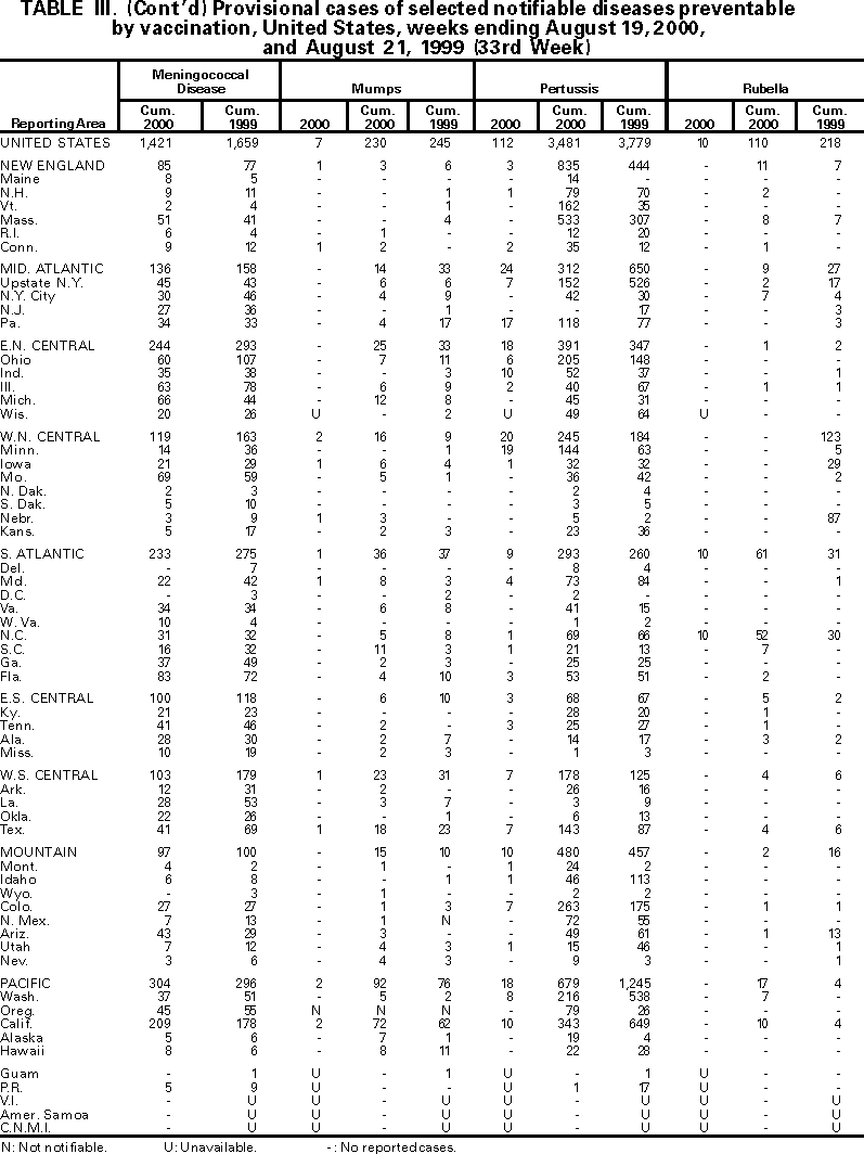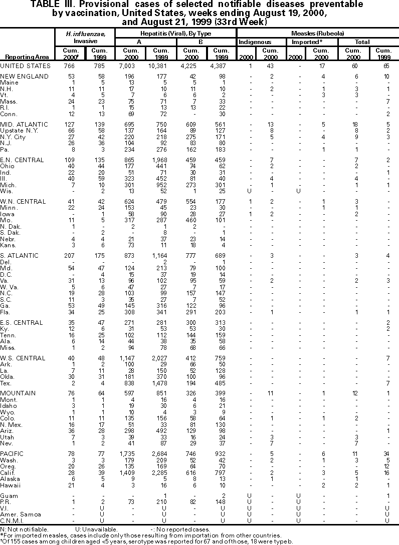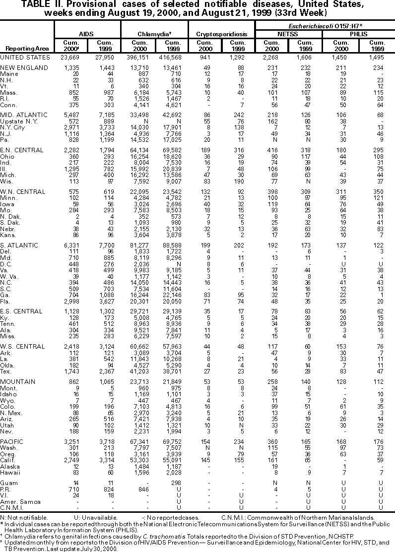 Persons using assistive technology might not be able to fully access information in this file. For assistance, please send e-mail to: mmwrq@cdc.gov. Type 508 Accommodation and the title of the report in the subject line of e-mail. Notifiable Diseases/Deaths in Selected Cities Weekly InformationFigure I Selected notifiable disease reports, comparison of provisional 4-week totals ending August 19, 2000, with historical data -- United States Table I Summary -- provisional cases of selected notifiable diseases, United States, cumulative, week ending August 19, 2000 (33rd Week) Table II Provisional cases of selected notifiable diseases, United States, weeks ending August 19, 2000 and August 21, 1999 (33rd Week) Table III Provisional cases of selected notifiable diseases preventable by vaccination, United States, weeks ending August 19, 2000 and August 21, 1999 (33rd Week) Table IV Deaths in 122 U.S. cities, week ending August 19, 2000 (33rd Week) Figure I ![]() Return to top. Table I ![]() Return to top. Table II