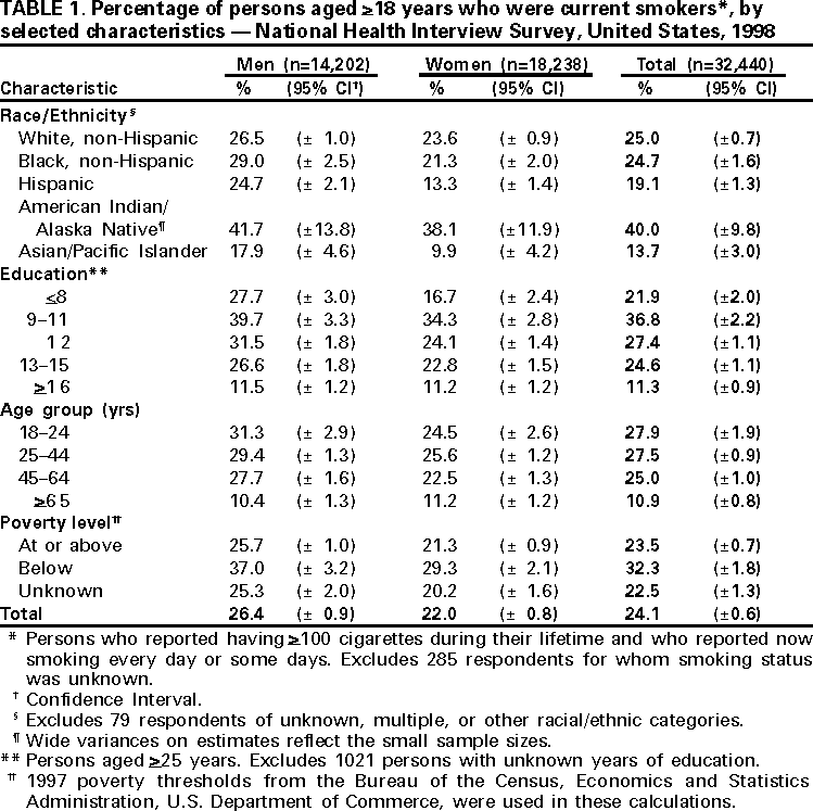 Persons using assistive technology might not be able to fully access information in this file. For assistance, please send e-mail to: mmwrq@cdc.gov. Type 508 Accommodation and the title of the report in the subject line of e-mail. Cigarette Smoking Among Adults --- United States, 1998One of the national health objectives for 2010 is to reduce the prevalence of cigarette smoking among adults to no more than 12% (objective 21.1a) (1). To assess progress toward meeting this objective, CDC analyzed self-reported data from the 1998 National Health Interview Survey (NHIS) Sample Adult Core Questionnaire about cigarette smoking among U.S. adults. This report summarizes the findings of this analysis, which indicate that, in 1998, 24.1% of adults were current smokers. The 1998 NHIS Core Questionnaire was administered to a nationally representative sample (n=32,440) of the U.S. noninstitutionalized civilian population aged >18 years; the overall response rate for the survey was 73.9%. Participants were asked, "Have you smoked at least 100 cigarettes in your entire life?" and "Do you now smoke cigarettes every day, some days, or not at all?" Current smokers were persons who reported both having smoked >100 cigarettes during their lifetime and having smoked every day or some days at the time of the interview. Former smokers were those who had smoked >100 cigarettes during their lifetime but did not currently smoke. Attempts to quit were determined by asking current smokers, "During the past 12 months, have you stopped smoking for one day or longer because you were trying to stop smoking?" Data were adjusted for nonresponse and weighted to provide national estimates. Confidence intervals (CIs) were calculated using SUDAAN. In 1998, an estimated 47.2 million adults (24.1%), comprising 24.8 million men (26.4%) and 22.4 million women (22.0%), were current smokers (Table 1). Overall, 19.7% (95% CI=±0.6) of adults were everyday smokers, and 4.2% (95% CI=±0.3) were someday smokers (everyday smokers constituted 82.4% [95% CI=±1.0] of all smokers). Prevalence of smoking was highest among persons aged 18--24 years (27.9%) and aged 25--44 years (27.5%), and lowest among persons aged >65 years (10.9%). Prevalence of current smoking was highest among American Indians/Alaska Natives (40.0%), intermediate among non-Hispanic whites (25.0%) and non-Hispanic blacks (24.7%), and lowest among Hispanics (19.1%) and Asians/Pacific Islanders (13.7%). Adults with >16 years of education had the lowest smoking prevalence (11.3%), achieving the 2010 goal of reducing smoking rates to no more than 12%. Current smoking prevalence was highest among persons with 9--11 years of education (36.8%). Smoking prevalence was higher among persons living below the poverty level* (32.3%) than among those living at or above the poverty level (23.5%). In 1998, an estimated 44.8 million adults (22.9% [95% CI=±0.6]) were former smokers, comprising 25.7 million men and 19.1 million women. Former smokers constituted 48.7% (95% CI=±1.0) of persons who had ever smoked >100 cigarettes. Among current daily smokers in 1998, an estimated 15.2 million (39.2% [95% CI=±1.4]) had stopped smoking for at least 1 day during the preceding 12 months because they were trying to stop smoking. Reported by: Epidemiology Br, Office on Smoking and Health, National Center for Chronic Disease Prevention and Health Promotion, CDC. Editorial Note:The findings in this report suggest that the goal of reducing the prevalence of cigarette smoking among adults to <12% by 2010 will require aggressive public health efforts to implement comprehensive tobacco-control programs nationwide (2). The 1998 NHIS data also demonstrate substantial differences in smoking prevalence across populations. In 1998, smoking prevalence among persons aged 18--24 years was as high as the prevalence among persons aged 25--44 years. Historically, smoking prevalence has been highest among persons aged 25--44 years and significantly lower among persons aged 18--24 years. Recent increases among persons aged 18--24 years may reflect the aging of the cohort of high school students among whom current smoking rates were high during the 1990s (3). In addition, the increase may indicate increased initiation of smoking among young adults. The high prevalence of smoking among young adults indicates a need to focus tobacco-use prevention and treatment programs on both adolescents and young adults. Smoking prevalence reported for racial/ethnic subgroups showed few changes from 1997 (4) to 1998. Prevalence of current smoking among American Indians/Alaska Natives remained the highest. State and regional surveys indicate that the prevalence of smoking cessation among American Indians/Alaska Natives remains relatively low (5). Although many factors contribute to the high prevalence of smoking among American Indians/Alaska Natives, it is important to develop culturally appropriate prevention and control measures that distinguish between the use of manufactured tobacco products and the ceremonial use of tobacco. National health objectives for 2010 that are focused on eliminating population disparities reinforce the need for greater surveillance and culturally responsive approaches to tobacco use across communities (1). In the United States, population disparities in smoking prevalence have been consistent from 1993 through 1998. For example, in 1993, an 8.3 (95% CI=±2.5) percentage-point difference in smoking prevalence existed between those at or above the poverty level and those below (23.8% and 32.1%, respectively). In 1998, the difference was 8.8 (95% CI=±1.9) percentage points (23.5% and 32.3%, respectively). Similarly, differences in prevalence among various educational groups have not been reduced. In 1993, the difference between those with 9--11 years of education and those with >16 years was 23.3 (95% CI=±3.0) percentage points (36.8% and 13.5%, respectively). In 1998, the difference was 25.5 (95% CI=
