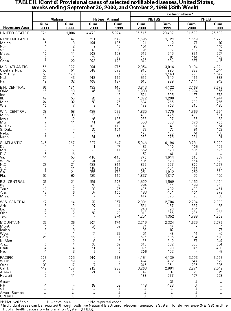 Table II   Provisional cases of selected notifiable diseases, United States, weeks ending September 30, 2000 and October 2, 1999 (39th Week)