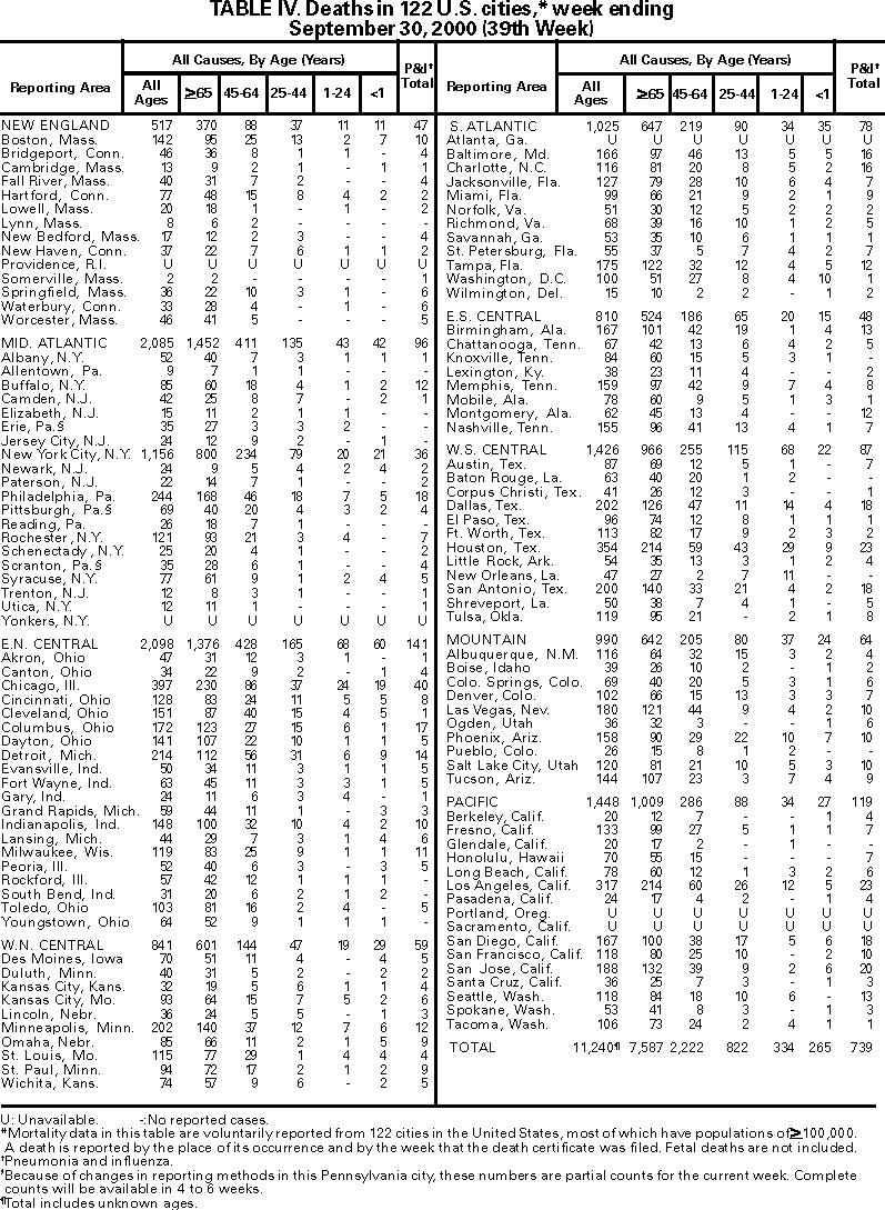 Table IV   Deaths in 122 U.S. cities, week ending September 30, 2000 (39th Week)