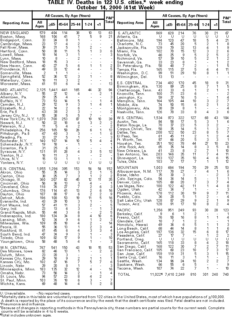 Persons using assistive technology might not be able to fully access information in this file. For assistance, please send e-mail to: mmwrq@cdc.gov. Type 508 Accommodation and the title of the report in the subject line of e-mail. Notifiable Diseases/Deaths in Selected Cities Weekly InformationFigure I Selected notifiable disease reports, United States, comparison of provisional 4-week totals ending October 14, 2000, with historical data Table I Summary -- provisional cases of selected notifiable diseases, United States, cumulative, week ending October 14, 2000 (41st Week) Table II Provisional cases of selected notifiable diseases, United States, weeks ending October 14, 2000 and October 16, 1999 (41st Week) Table III Provisional cases of selected notifiable diseases preventable by vaccination, United States, weeks ending October 14, 2000 and October 16, 1999 (41st Week) Table IV Deaths in 122 U.S. cities, week ending October 14, 2000 (41st Week) Figure I ![]() Return to top. Table I ![]() Return to top. Table II
