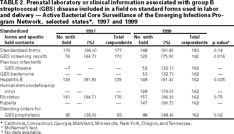Persons using assistive technology might not be able to fully access information in this file. For assistance, please send e-mail to: mmwrq@cdc.gov. Type 508 Accommodation and the title of the report in the subject line of e-mail. Erratum: Vol 49, No. 41In the article, "Hospital-Based Policies for Prevention of Perinatal Group B Streptococcal Disease United States, 1999," on page 938 in Table 2, the denominator in 1997 for "Hepatitis B" should be 170 hospitals and the denominator for "Standing Orders for GBS prophylaxis" should be 176 hospitals. Table 2 ![]() Return to top. Disclaimer All MMWR HTML versions of articles are electronic conversions from ASCII text into HTML. This conversion may have resulted in character translation or format errors in the HTML version. Users should not rely on this HTML document, but are referred to the electronic PDF version and/or the original MMWR paper copy for the official text, figures, and tables. An original paper copy of this issue can be obtained from the Superintendent of Documents, U.S. Government Printing Office (GPO), Washington, DC 20402-9371; telephone: (202) 512-1800. Contact GPO for current prices. **Questions or messages regarding errors in formatting should be addressed to mmwrq@cdc.gov.Page converted: 10/26/2000 |