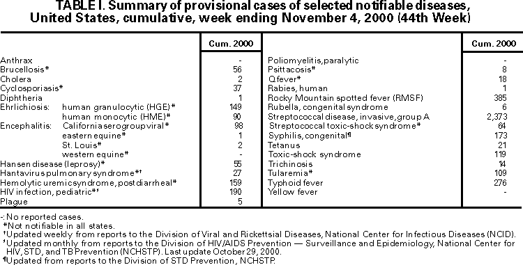 Persons using assistive technology might not be able to fully access information in this file. For assistance, please send e-mail to: mmwrq@cdc.gov. Type 508 Accommodation and the title of the report in the subject line of e-mail. Notifiable Diseases/Deaths in Selected Cities Weekly InformationFigure I Selected notifiable disease reports, United States, comparison of provisional 4-week totals ending November 4, 2000, with historical data Table I Summary -- provisional cases of selected notifiable diseases, United States, cumulative, week ending November 4, 2000 (44th Week) Table II Provisional cases of selected notifiable diseases, United States, weeks ending November 4, 2000 and November 6, 1999 (44th Week) Table III Provisional cases of selected notifiable diseases preventable by vaccination, United States, weeks ending November 4, 2000 and November 6, 1999 (44th Week) Table IV Deaths in 122 U.S. cities, week ending November 4, 2000 (44th Week) Figure I ![]() Return to top. Table I ![]() Return to top. Table II