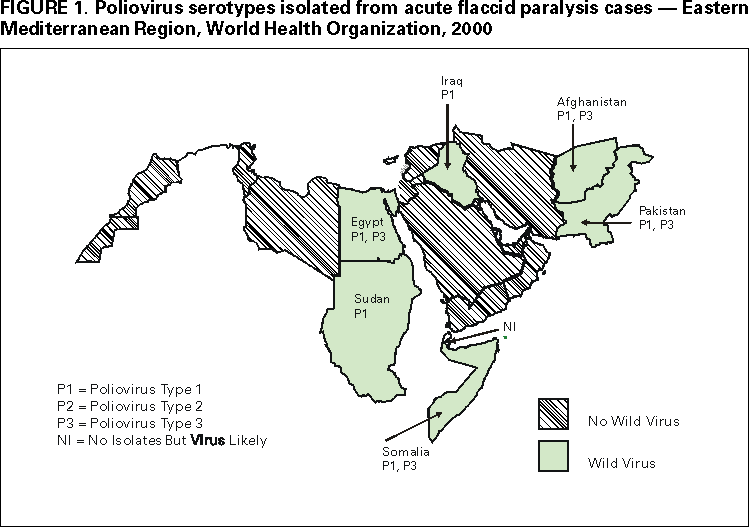 Persons using assistive technology might not be able to fully access information in this file. For assistance, please send e-mail to: mmwrq@cdc.gov. Type 508 Accommodation and the title of the report in the subject line of e-mail. Progress Toward Poliomyelitis Eradication --- Eastern Mediterranean Region, 1999--September 2000In 1988, the Regional Committee for the Eastern Mediterranean Region* (EMR) of the World Health Organization (WHO) adopted a resolution to eradicate poliomyelitis from the region by 2000. Since then, substantial progress has been made in vaccination and surveillance and, by the end of the year, 19 of the 23 EMR countries are expected to have interrupted poliovirus transmission. This report summarizes progress toward this goal from January 1999 through September 2000. Routine vaccination coverage. In 1999, the regional reported coverage with at least three doses of oral poliovirus vaccine (OPV3) by age 1 year was 83% (range: 18%--100%), compared with 82% in 1998. OPV3 coverage of >90% was reported from 14 countries. Coverage levels of <80% were reported from Afghanistan (32%), Djibouti (27%), Pakistan (80%), Somalia (18%, only northern regions reporting), Sudan (77%), and Yemen (72%). These countries represent more than half of the total regional population. Compared with reported administrative data, surveys in some of these countries have identified lower coverage rates. Supplementary vaccination activities. During 1999, National Immunization Days (NIDs) were conducted in 20 of the 23 countries of the region. Iran and Tunisia conducted targeted subnational campaigns in provinces at risk for poliovirus importation and/or with suboptimal vaccination coverage, and NIDs have not been considered necessary in Cyprus. In 2000, several countries that have been polio-free have scaled down the scope of supplementary vaccination activities from NIDs to subnational or local campaigns. During 1999--2000, NIDs and other supplementary vaccination activities have been intensified in countries with persistent poliovirus circulation (Afghanistan, Egypt, Iraq, Pakistan, Somalia, and Sudan). In 1999, each of these countries either conducted two pairs (four rounds) of NIDs (Afghanistan, Egypt, and Iraq) or one pair of NIDs and one pair of large-scale subnational campaigns (Pakistan, Somalia, and Sudan). During 2000, each of these six countries will conduct two pairs of NIDs and additional mopping up or subnational campaigns. The quality of campaigns in these remaining countries where polio is endemic has been improved substantially through house-to-house vaccination, greater emphasis on high-risk areas, improved planning and supervision, additional financial resources, and increased technical consultation. Campaigns are coordinated among groups of contiguous countries within EMR. Coordination with the European region has led to elimination of the poliovirus reservoir in the border areas of Iran, Iraq, Syria, and Turkey (1). Cross-border coordination will continue between Afghanistan, Pakistan, and Iran. Increasing attention is being focused on collaboration with the regional office of WHO for Africa to coordinate eradication activities among countries of the Horn of Africa and countries that border western and southern Sudan. Surveillance. All member countries have established acute flaccid paralysis (AFP) surveillance. Fifteen countries (Bahrain, Egypt, Iran, Iraq, Jordan, Lebanon, Libya, Oman, Pakistan, Palestine, Qatar, Saudi Arabia, Syria, Tunisia, and Yemen) achieved or exceeded the WHO-established minimum AFP reporting rate indicative of a sensitive surveillance system (>1 nonpolio AFP case per 100,000 children aged <15 years) during 1999 (Table 1). Among the eight remaining countries, the annualized nonpolio AFP reporting rates during 2000 have exceeded one in Afghanistan, Kuwait, Somalia, and Sudan. The regional average reporting rates for nonpolio AFP in 1999 and 2000 are 1.1 and 1.3 (annualized), respectively. During 1999 and 2000, two adequate stool samples were collected from 67% and 71% of the reported persons with AFP in EMR, respectively. During 1999, nine countries (Bahrain, Cyprus, Iraq, Jordan, Kuwait, Oman, Palestine, Syria, and Tunisia) achieved the WHO-recommended target of collecting two adequate stool specimens from at least 80% of persons with AFP. During 2000, an additional four countries (Egypt, Lebanon, Libya, and Saudi Arabia) achieved this target. EMR laboratory network. The EMR laboratory network consists of 12 laboratories (eight national and four regional reference laboratories). All network laboratories have been fully or provisionally accredited by WHO. As of September 2000, the EMR laboratory network tested 4129 stool specimens obtained from 1947 (96%) of 2028 persons with reported AFP (or their contacts) from 21 EMR countries. Specimens from an additional 142 persons with AFP reported from Somalia and southern Sudan were tested in the laboratory network of the African region. Laboratory results were reported on time (within 28 days of receipt of specimen) for >80% of stool specimens during 1999--2000. Genetic sequence analyses are performed routinely on all wild poliovirus isolates in the region. Recent sequence data have identified separate virus reservoirs shared between Pakistan and Afghanistan and between Chad and Sudan. With improvements in surveillance, independent and unique transmission chains of poliovirus types 1 and 3 have been identified in Afghanistan, Somalia, and Sudan. Communities with persistent foci of virus transmission have been better delineated in Egypt. Sequencing of a recent wild poliovirus isolate obtained in Syria confirmed that the strain was imported recently from southern Asia. Incidence of polio. Compared with the same period in 1999, the number of confirmed cases of polio reported through September 2000 in the EMR has decreased by approximately 50% (from 619 to 314) despite substantial improvements in AFP surveillance. C