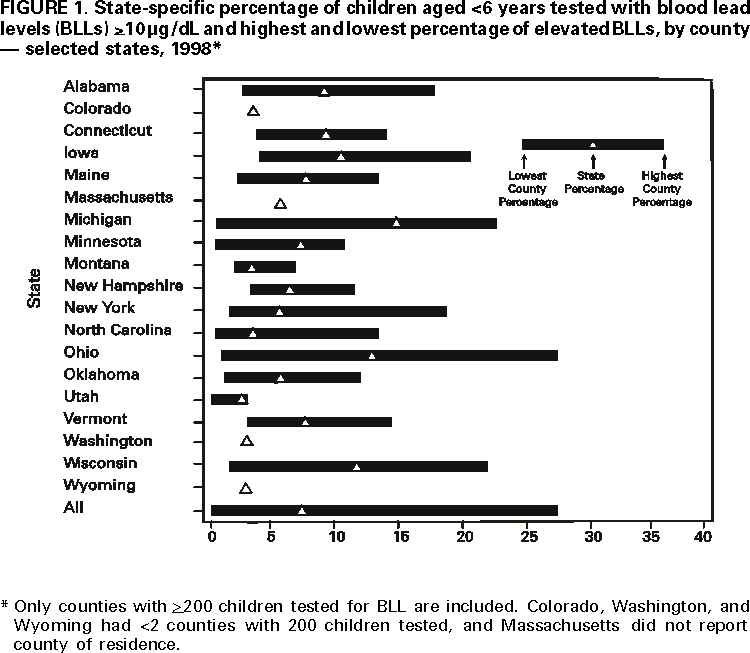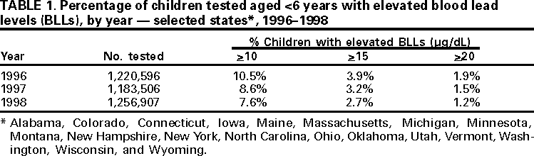 Persons using assistive technology might not be able to fully access information in this file. For assistance, please send e-mail to: mmwrq@cdc.gov. Type 508 Accommodation and the title of the report in the subject line of e-mail. Blood Lead Levels in Young Children ---United States and Selected States, 1996--1999Lead exposure adversely affects the cognitive development and behavior of young children (1). For children aged <6 years, CDC has defined an elevated blood lead level (BLL) as >10 µg/dL, but evidence exists for subtle effects at lower levels (2). Data from CDC's Third National Health and Nutrition Examination Survey, Phase 2 (1991--1994) (NHANES) showed that average BLLs in children had decreased approximately 80% since the late 1970s but that elevated BLLs remained more common among low-income children, urban children, and those living in older housing (3,4). Although these data provide national estimates of the prevalence of elevated BLLs among children, they do not provide information at the state or local level. To target prevention efforts and monitor progress toward reducing BLLs at the state and local level, CDC's Childhood Blood Lead Surveillance (CBLS) program supports state blood lead surveillance programs on the basis of blood lead tests from public and private clinical laboratories. This report summarizes data on BLLs in children aged 1--5 years from NHANES data collected in 1999 and children aged <6 years from state surveillance data provided to CDC by 19 state surveillance programs during 1996--1998. The findings indicate that, despite the decreases in mean BLL among children, the problem remains concentrated on a local level. Surveillance efforts should be used to target screening efforts to communities at highest risk. NHANES is a continuous survey of the health and nutritional status of the U.S. civilian, noninstitutionalized population designed so that each year of data constitutes a nationally representative sample. Data in this report are from NHANES 1999, and NHANES III, Phase 2. A household interview and a physical examination were conducted for each survey participant. During the physical examination, blood was collected by venipuncture for all persons aged >1 year. Graphite furnace atomic absorption spectrophotometry was used to measure BLLs with detection limits of 0.3 µg/dL (NHANES 1999) and 1.0 µg/dL (NHANES III, Phase 2). Long-term quality-control data for these analyses, including similar standardized reference materials, were used in both surveys and showed that data from the two surveys can be compared. Because of limited sample size, NHANES 1999 analyses include only data on average BLLs and selected percentiles but not on the prevalence of elevated levels. The analyses of CBLS data were based on reports from 19 of 28 states that provided blood lead data to CDC (Table 1). The 19 states were included because they received all blood lead test results of children from participating laboratories (regardless of level) and reported data from January 1, 1996 through December 31, 1998. These states accounted for 33% of all U.S. children aged <6 years. An elevated BLL from CBLS is defined as a single blood lead test result >10 µg/dL. If multiple tests were reported for a child during a calendar year, the highest BLL measured for that child was used. To estimate the proportion of children with elevated BLLs among those tested, the number of children with elevated levels was divided by the number of children tested at least once during a calendar year. From NHANES III, Phase 2 (1991--1994) to NHANES 1999, the geometric mean BLL in children aged 1--5 years decreased from 2.7 (95% confidence interval [CI]=2.6--2.9) to 2.0 µg/dL (95% CI=1.7--2.3), and the 50th percentile decreased from 2.6 (95% CI=2.4--2.8) to 1.9 µg/dL (95% CI=1.6--2.1). The continued pattern of decline in BLLs between the two surveys also is indicated at the 10th, 25th, 75th, and 90th percentiles. The CBLS data showed that the proportion of children tested with BLLs >10 µg/dL decreased from 10.5% in 1996 to 7.6% in 1998 in the 19 states providing data (Table 1). The proportions of children with BLLs >15 µg/dL and >20 µg/dL also decreased. The percentage of children aged <6 years tested with BLLs >10 µg/dL in each state ranged from 2.7 to 14.9 (Figure 1). Within states, the proportion of children with elevated BLLs in counties with at least 200 children tested also varied considerably. For example, the proportion of children with elevated BLLs ranged from 1.3% to 27.3% in counties in Ohio. Across all 19 states, the county-specific proportions of children with elevated BLLs ranged from 0.5% to 27.3%, indicating a concentrated proportion of elevated BLLs in specific populations or geographic areas. Reported by: JP Lofgren, MD, State Epidemiologist, Alabama Dept of Public Health. M Macias, MHS, Childhood Lead Poisoning Prevention Program, Colorado Dept of Health. S Russakow, Childhood Lead Poisoning Prevention Program, Connecticut Dept of Public Health. R Gergely, B McPartland, Childhood Lead Poisoning Prevention Program, Iowa Dept of Public Health. M Amrich, Childhood Lead Poisoning Prevention Program, Maine Dept of Human Svcs; J Krueger, Maine Health and Environmental Testing Laboratory. M Silverman, I Caceres, MS, Childhood Lead Poisoning Prevention Program, Massachusetts Dept of Health. Michigan Dept of Public Health. J Wooldridge, D Symonik, MS, M Falken, PhD, Childhood Lead Poisoning Prevention Program, Minnesota Dept of Health. M Stout, Butte Silver-Bow County Health Dept, Mt. Lead; T Krantz, Montana Dept of Public Health and Human Svcs. T Ward, E Norman, MPH, Childhood Lead Poisoning Prevention Program, Dept of Environment and Natural Resources, Div of Environmental Health, North Carolina. N Twitchell, C Eccleston, Childhood Lead Poisoning Prevention Program, New Hampshire Dept of Health and Human Svcs. J Raucci, Childhood Lead Poisoning Prevention Program, New York State Dept o